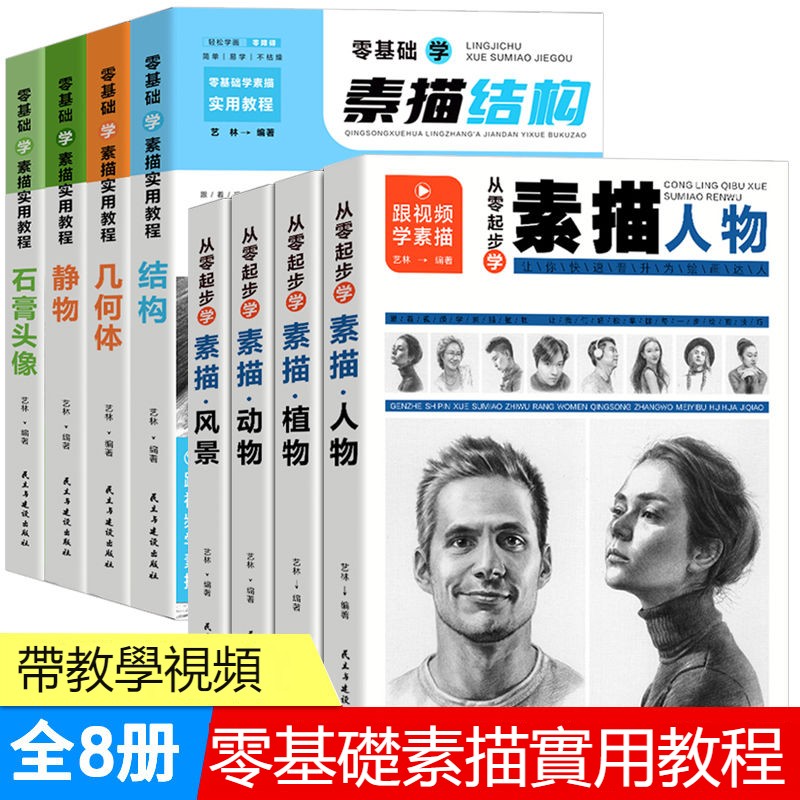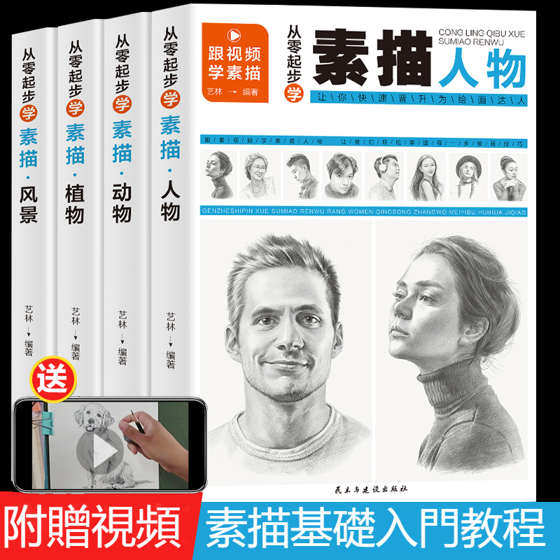 全4冊 素描書零基礎教程教材從入門到精通自學臨摹風景人物美術繪畫,附視頻教程