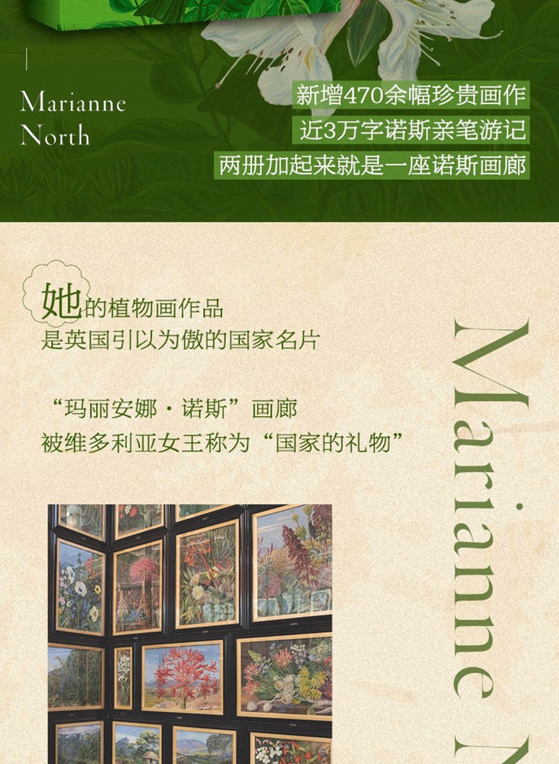 本書作為《花朵與探險:瑪麗安娜·諾斯的藝術世界》的璀璨續篇,精心收錄了諾斯畫廊中剩餘的400餘幅珍貴畫作(包括大量旅行風景、風土人情的記錄),兩本組成了一座完整的諾斯畫廊,把維多利亞女王親封“國家的禮物”帶回家。