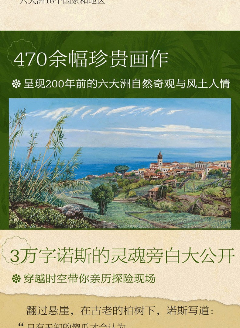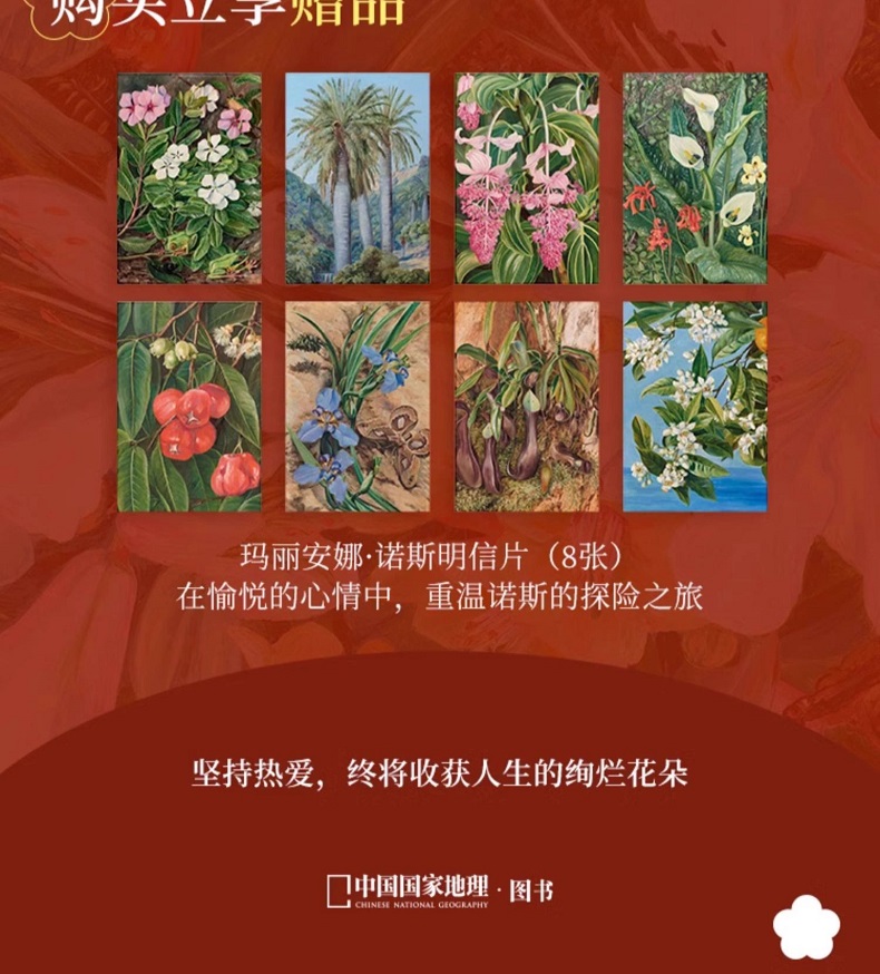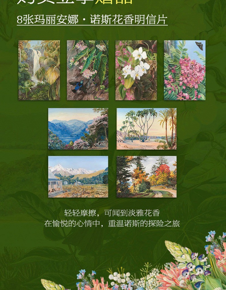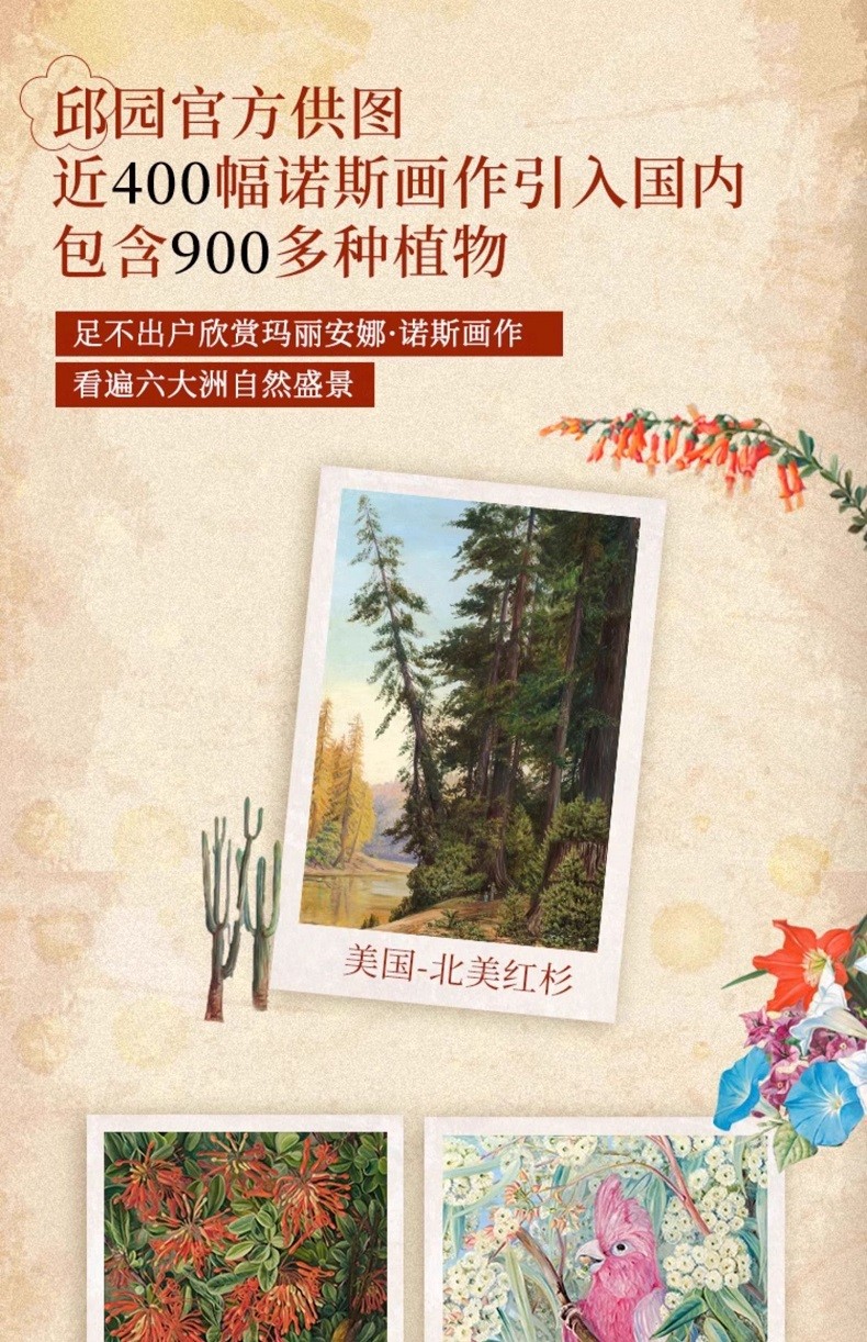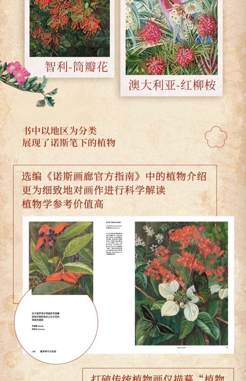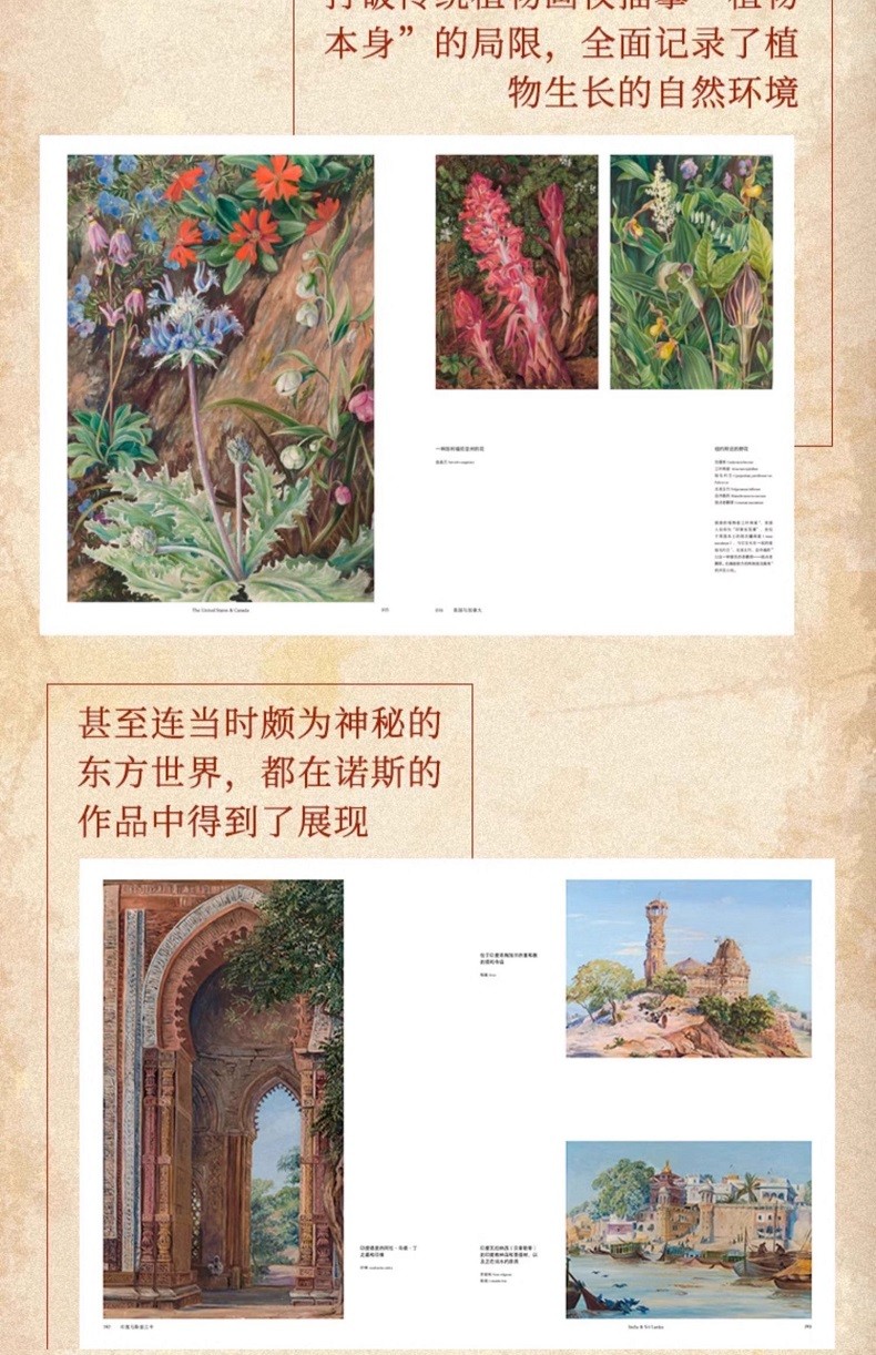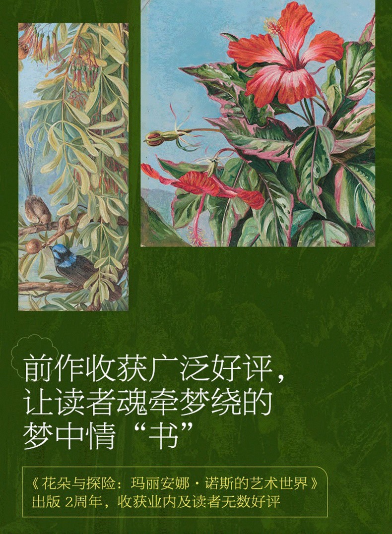 全書搭配近3萬字遊記,用第一視角記錄了她的全球探險經歷和植物發現之旅,兩本畫冊交相輝映,共同構成了瑪麗安娜·諾斯畢生科學探索和藝術成就的完整畫卷。她環遊世界六大洲,用細膩而豐富的筆觸,為我們探索、描繪了自然的神奇與壯麗,更用她的作品激發了人們對世界的好奇與熱愛,教育了一代又一代人去探索、珍惜這個多彩多姿的地球家園。