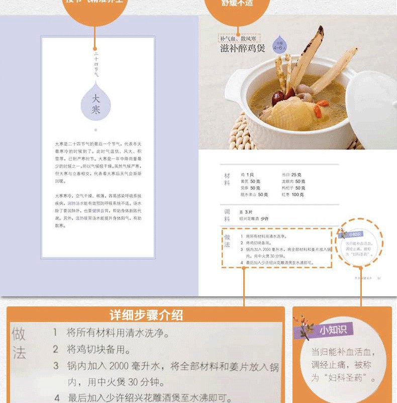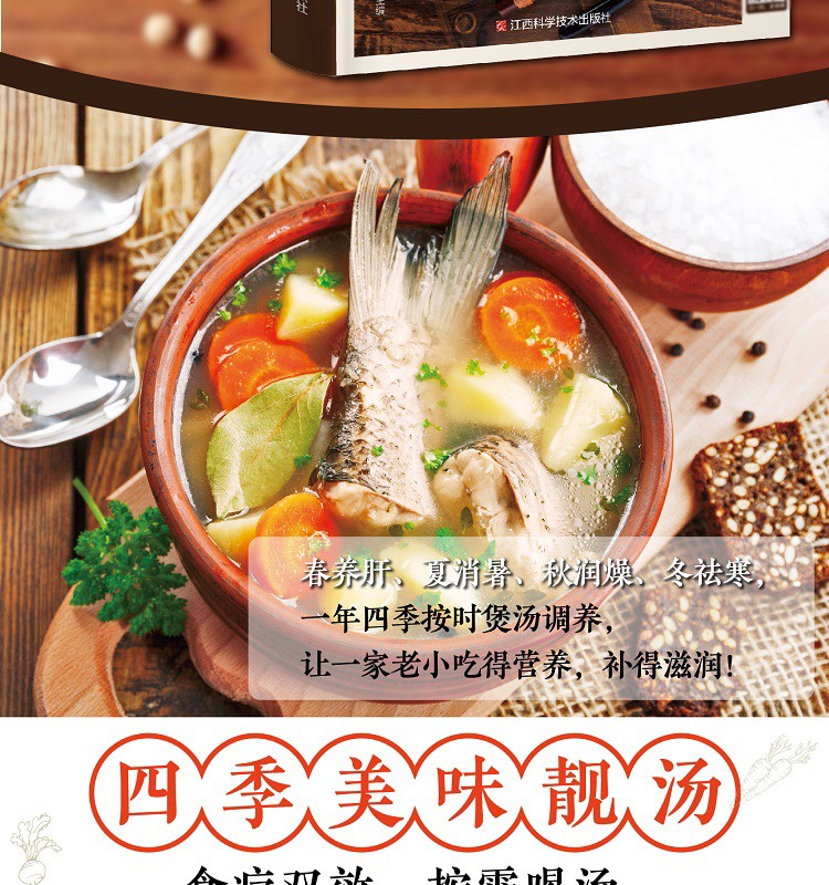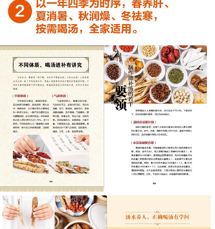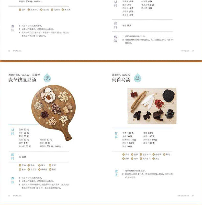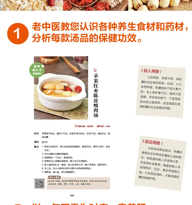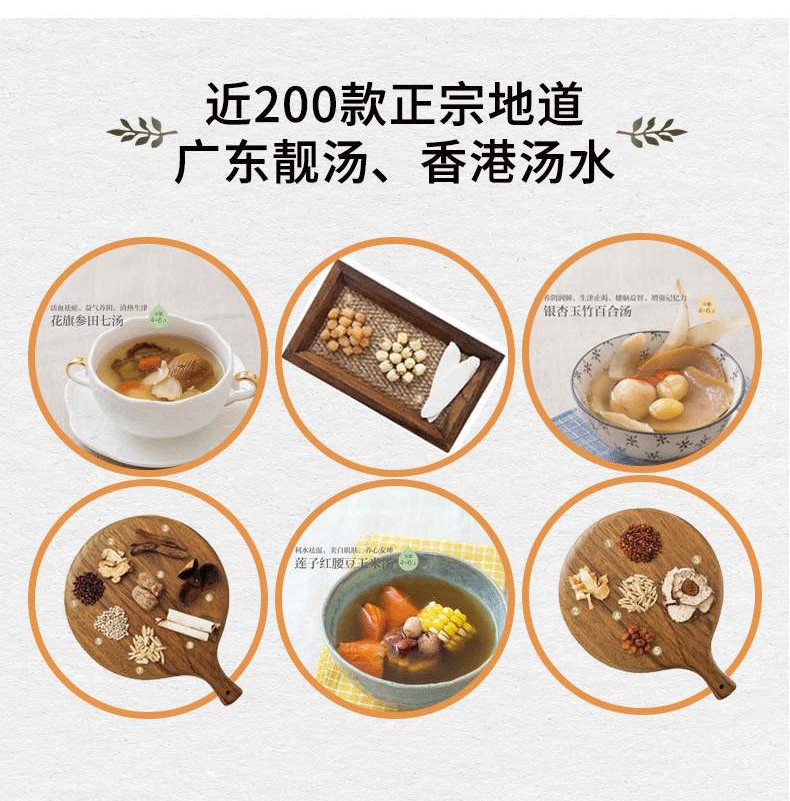 書中所提供湯膳,大都是家常湯,根據不同季節、不同人群、不同體質和各種疾病情況,適當加入了相應的中藥,以起到祛病防病的效果。湯膳中加入的中藥都是藥食兩用之品,取量精當,煲出的湯溫和中庸,無論是養生滋補,還是祛病防病,都可經常食用。