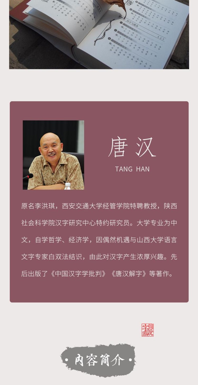 唐漢,原名李洪琪,西安交通大學經管學院特聘教授,陝西社會科學院漢字研究中心特約研究員。 大學專業為中文,自學哲學、經濟學,因偶然機會與山西大學語言文字專家白雙法結識,因此對漢字產生濃厚興趣。 先後出版了《中國漢字學批判》《唐漢解字》等著作。
