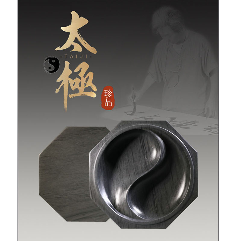 八卦太極原石帶蓋水波紋雙墨池歙硯(附 竹書籤,墨條,護養油,取水管)