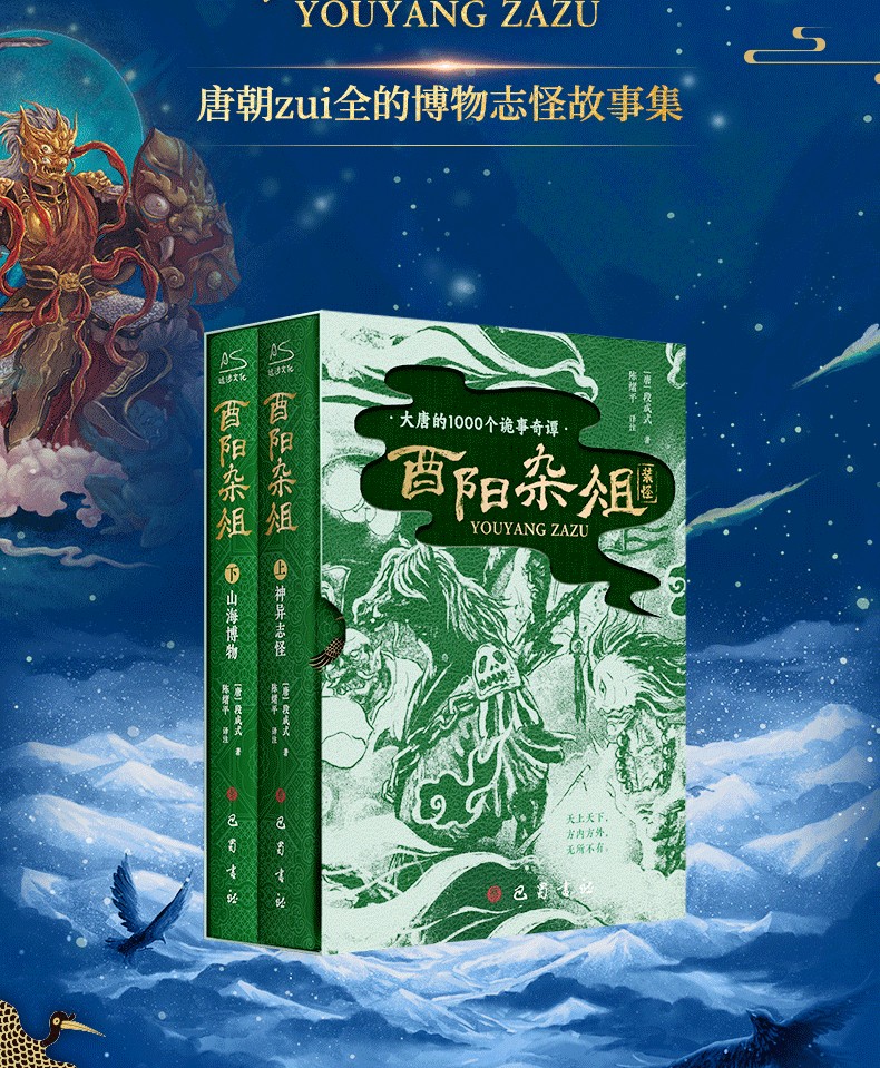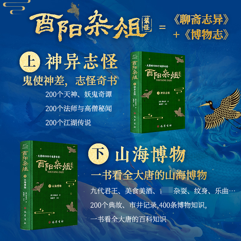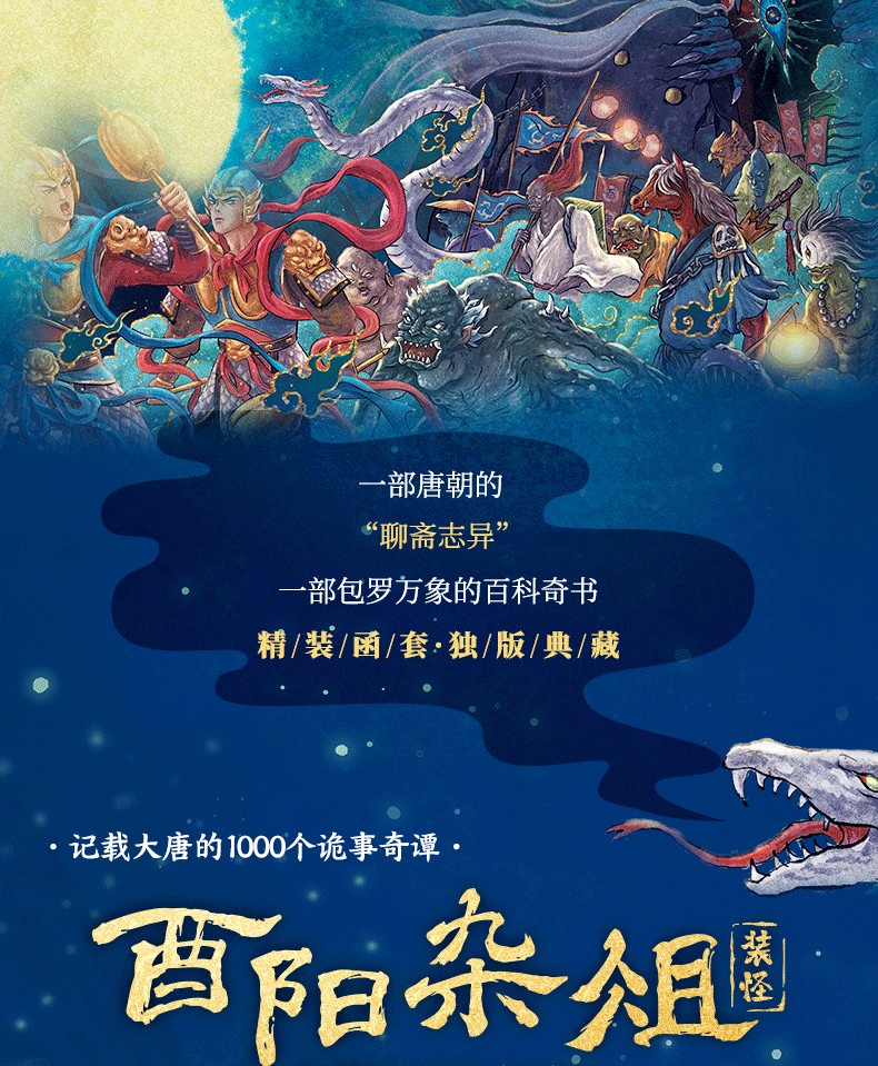 酉陽雜俎》唐代段成式創作的筆記小說集,共30卷,1000多個故事。分成上下兩部:上部神異志怪,上自女媧神話時代,下至唐朝時期,輯錄了600多個神話傳說、妖鬼奇譚與江湖故事;下部山海博物,近500個博物知識,從九代國王奇譚與江湖故事;下部山海博物,近500個博物知識,從九代部份到民間美食、刺青雜耍、醫術偏方…古老的生活無鉅細地講述唐事。
