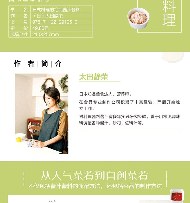 201種醬料調配,根據各國料理特點,按照材料和調製方法清晰分類,方便查找。與書中醬汁完美搭配的201種菜品,製作步驟清楚,是餐廳製作人氣醬汁料理的不錯參考。