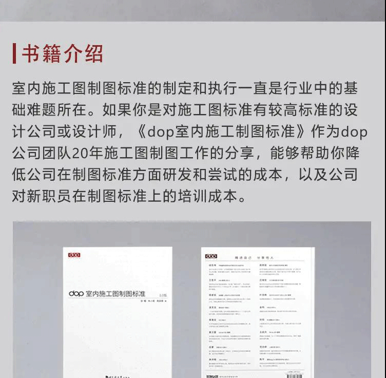《dop室內施工圖實戰教程》以專業知識和圖紙繪製兩條主線,融入了大量從實際案例中提煉出來的實戰經驗,一方面能夠幫助年輕設計師以及設計專業的在校學生快速有效地提升對施工圖的認知**和設計能力;另一方面也希望能為設計公司在內部施工圖培訓方面給出支持。