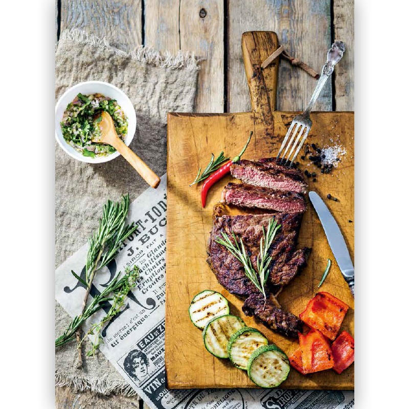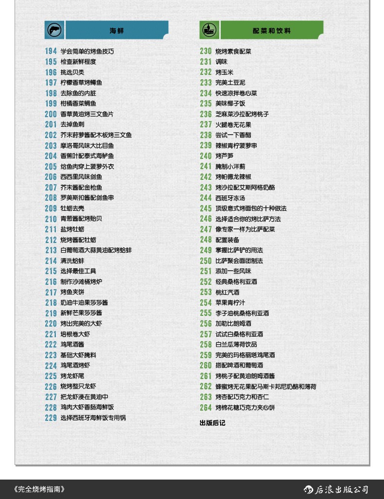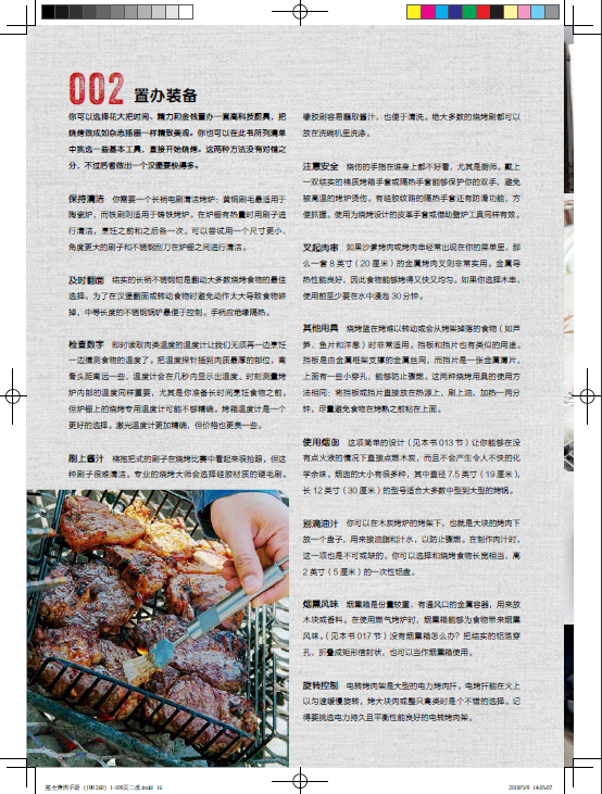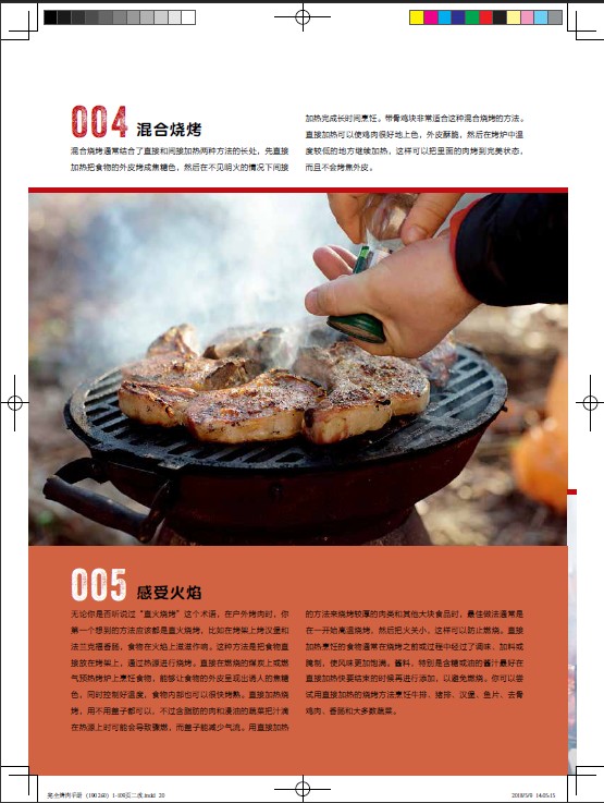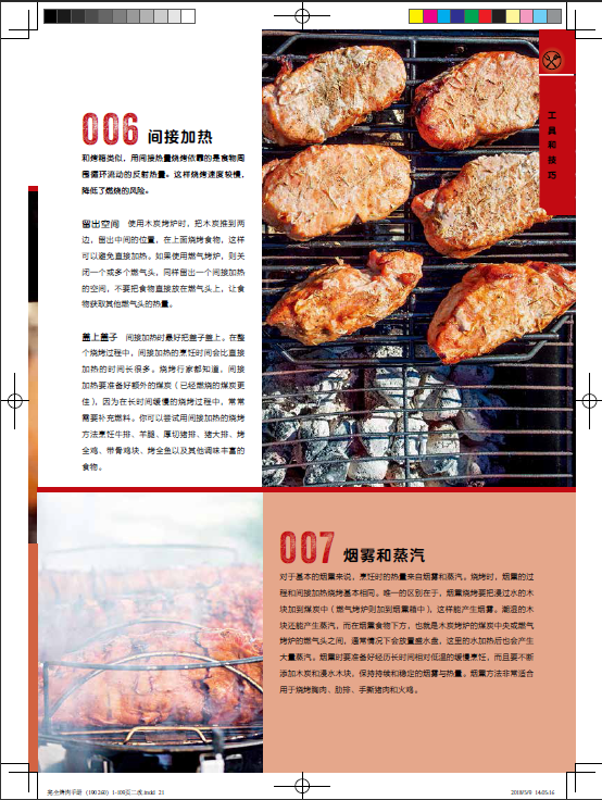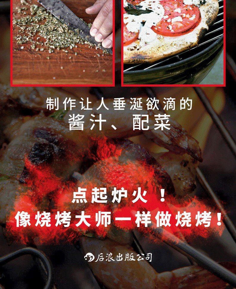 閃烤牛排、茶熏鴨胸肉、烤肉比薩、棉花糖蛋糕的食譜都能在這本書中找到。章節按照牛肉、豬肉、羊肉、家禽、海鮮分類,配以全面的工具和技巧介紹,比如揉搓、醃製、調味等方法,並輔以配菜和飲品的搭配建議。
