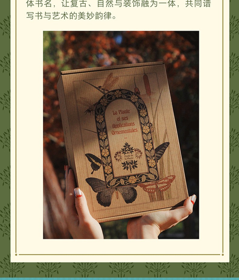 飛機盒為牛皮紙四色印刷,花草間嬉戲的蜻蜓與蝴蝶游弋在原木質感的紙張上,點綴著原版的舊體書名,讓復古、自然與裝飾融為一體,共同譜寫書與藝術的美妙韻律。