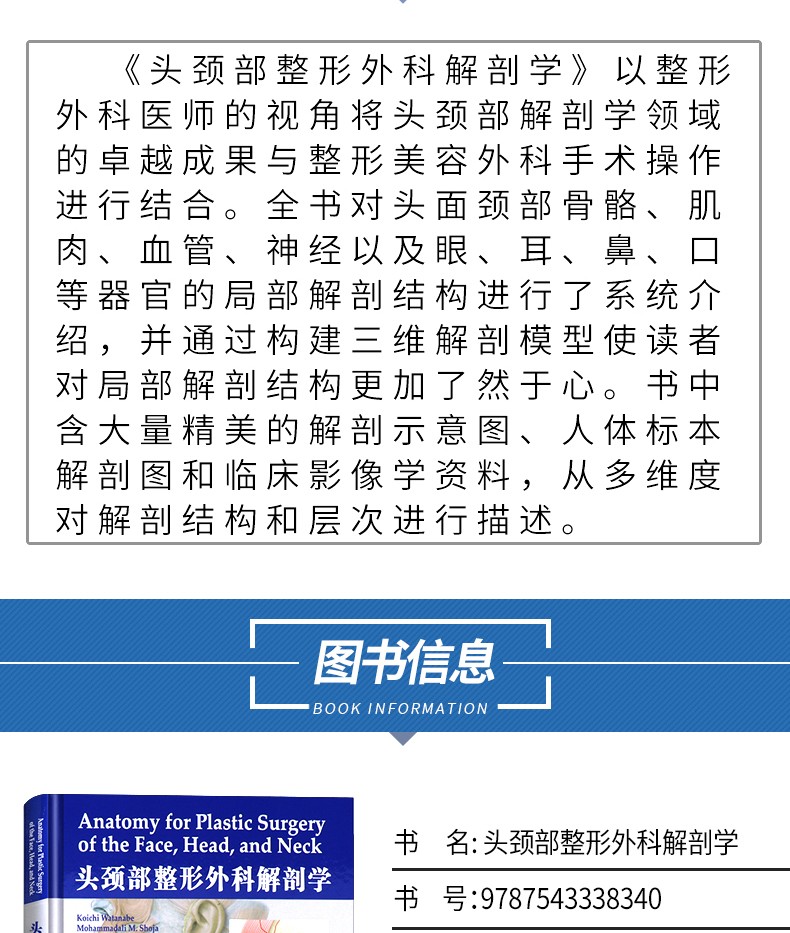 目前的外科教材中,絕少有著重描述解剖學的著作,特別是在整形外科領域,大多教材上的基礎解剖只是僅有寥寥數筆;而傳統的解剖學專著又未能充分闡釋手術中局部解剖的精髓;傳統解剖圖譜和教科書中描繪目標結構的詳細形態都是二維的,但是整形外科手術中重要的是要了解術區的三維解剖知識,如每一根神經、血管在三維構象上走行的空間。 《頭頸部整形外科解剖學》一書正是這樣一本適合整形外科專業醫師的解剖著作,書中的知識可以幫助讀者形像地構建術區的三維解剖模型,而且書中“手術註解”等條目則進一步解釋了操作中的關鍵問題和注意事項,有助於讀者理論聯繫實際,快速掌握相關區域的解剖學要點,切實提高手術水平。