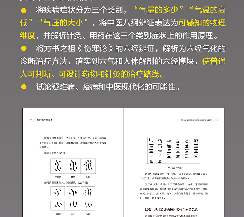 本書提出中醫的核心基礎為氣,並創建氣的建模假設,從而推導出中醫通過治氣來治病的具體方法。將抽象的中醫理論以簡單形象的模型來展示,演示出了中醫的病因、病機理論,以及中醫治病的方法。同時,將健康的觀念傳遞給讀者,告訴大家不要亂用藥,調整自己的身體狀態,改善自己的體質,將疾病防患於未然,才是健康的根本。