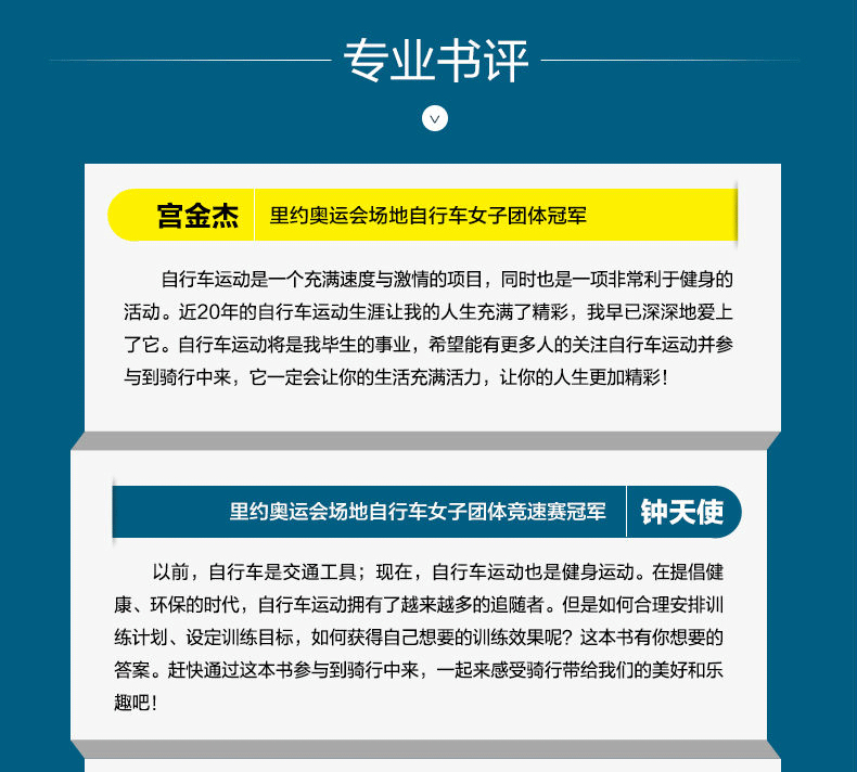 56套自行車運動訓練方案,涵蓋基礎性訓練、平地和多變地形訓練、爬坡訓練、計時訓練、衝刺訓練、室內訓練、非賽季訓練 ·專業詳解騎行技術、目標設定、訓練理念、訓練計劃制訂、恢復和損傷預防 ·有效提升肌肉力量、騎行速度和體能,全面提升騎行運動表現 中國場地自行車世界冠 軍 林俊紅 中國場地自行車全國錦標賽爭先冠 軍 包賽飛 中國場地自行車里約奧運會冠 軍 鍾天使 中國場地自行車亞洲錦標賽冠 軍 胡珂 中國場地自行車亞洲錦標賽冠 軍 徐超 聯袂推薦!