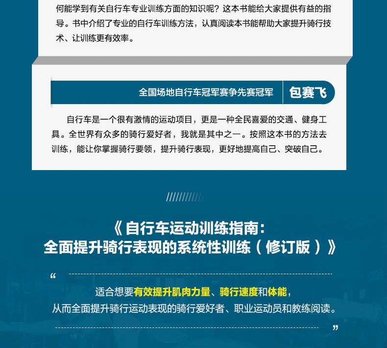 這是一本全面系統地講解自行車基礎體能訓練的指南,是一本針對自行車運動愛好者在車下進行訓練的手冊。全書共分6章,第1章介紹了人*車的協調統一,涵蓋了自行車方面的基礎知識及訓練要點;第2~4章分別從拉伸、力量、核心3個方面系統講解了具體的訓練方法及動作要領;第5章則重點介紹了交叉訓練的原則和方法;最後一章給出瞭如何進行週期化訓練和製訂訓練計劃等內容。