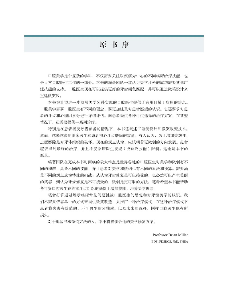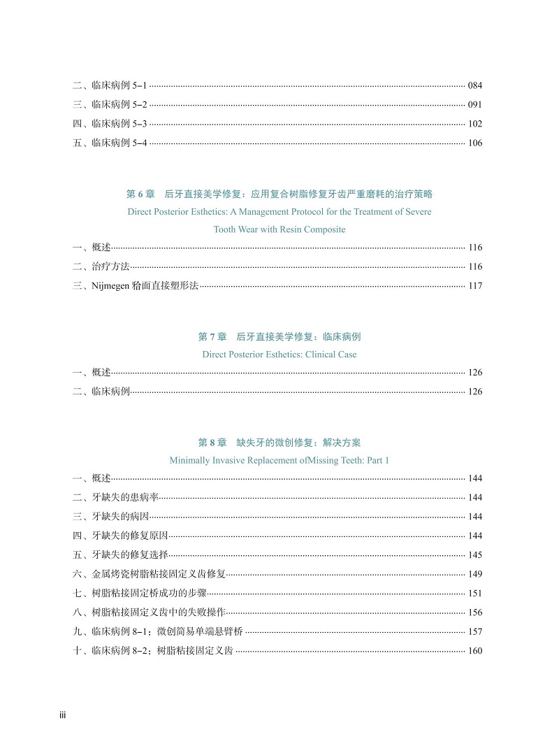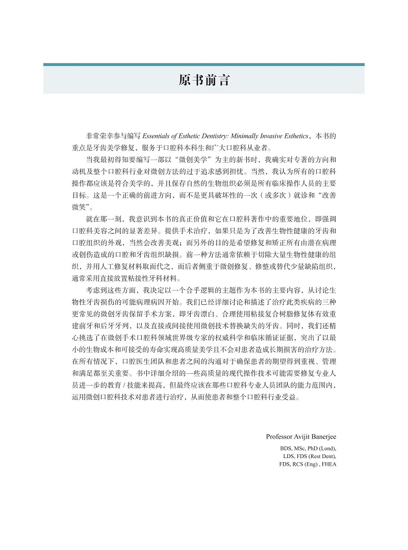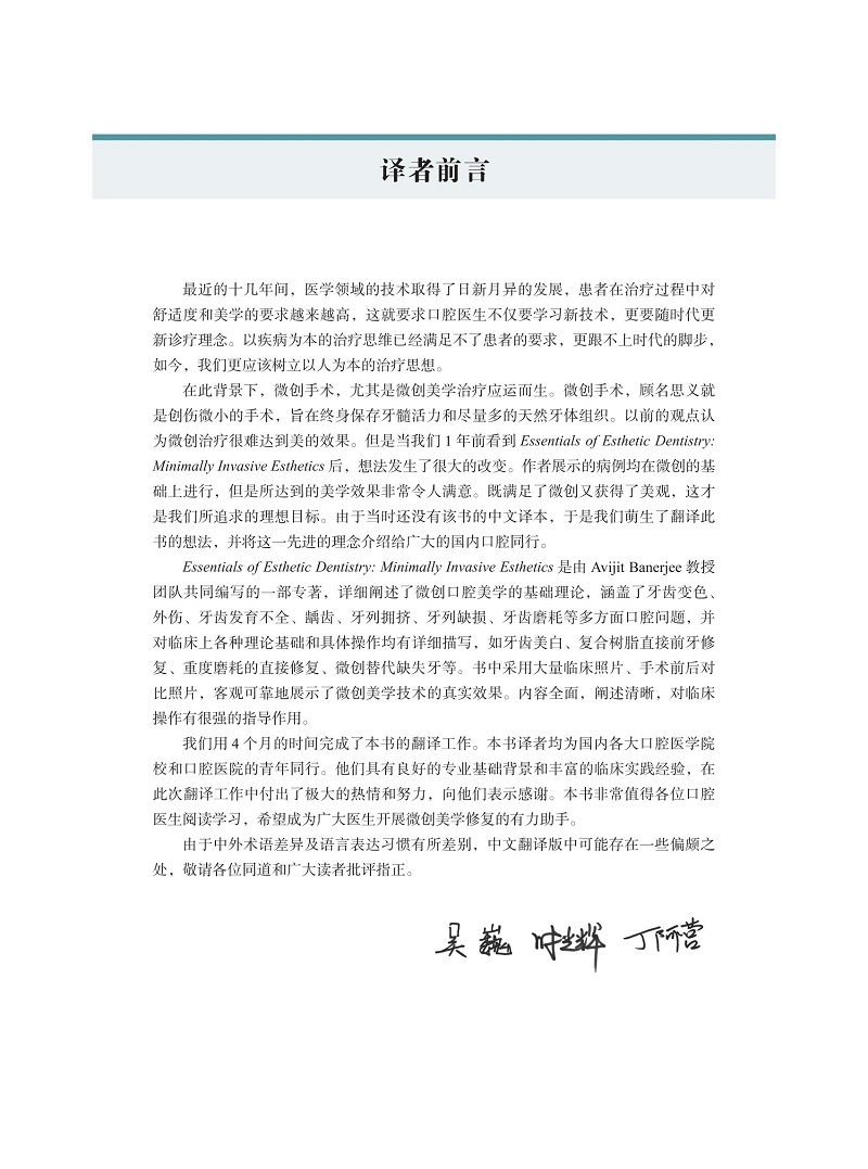 該書以臨床問題為導向,通過臨床案例介紹,包括治療前後照片的對比,客觀展示了微創美學修復的臨床效果,從資料收集、方案設計、問題列表、治療計劃與實施等方面,提出了多方面的臨床問題,分享了醫生團隊與患者的溝通及共識形成等方面的經驗;部分章節中的問題討論和處理也展示了椅旁管理的臨床邏輯。