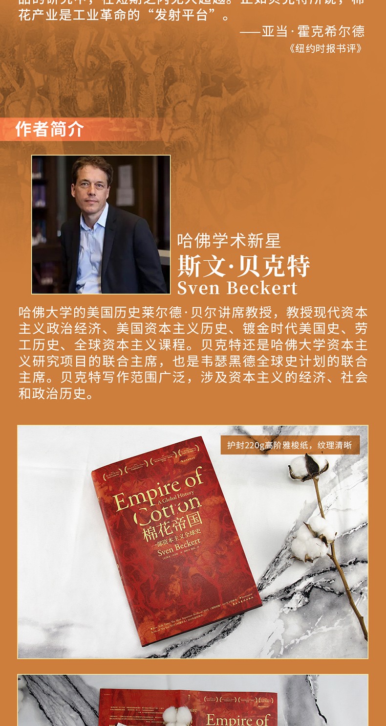 棉花產品在我們的生活中無處不在,以至於我們往往難以注意到它的重要性。但棉花產業的歷史實際上是與近代資本主義的歷史緊密關聯在一起,理解棉花產業發展史是理解資本主義和當代世界的關鍵。本書作者斯文?貝克特通過敘述棉花產業發展的歷史,解釋了歐洲國家和資本家如何在短時間內重塑了這個世界歷史上最重要的一項產業,並進而改變了整個世界面貌的。