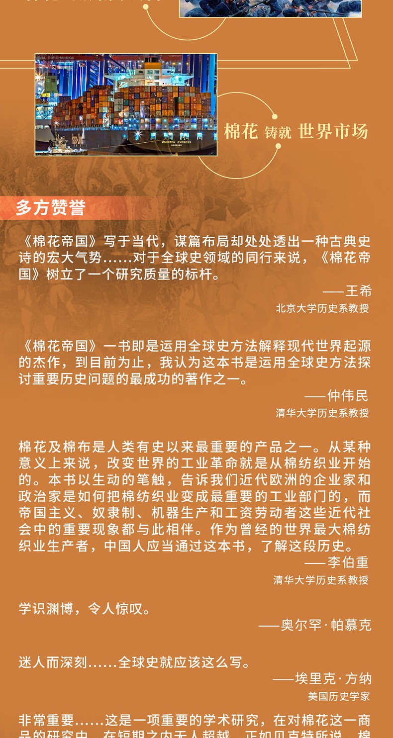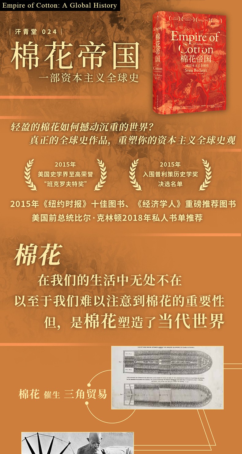 本書是名副其實的全球史,內容涉及五大洲,將非洲的販奴貿易和紅海貿易聯繫在了一起,將美國南北戰爭和印度棉花種植聯繫在了一起。在貝克特波瀾壯闊的巨著中,商人、商業資本家、經紀人、代理人、國家官僚、工業資本家、佃農、自耕農、奴隸都有自己的角色,貝克特清楚地表明,這些人的命運是如何與近代資本主義發展聯繫在一起的,又是如何塑造我們現在這個存在著巨大不平等的世界的。本書告訴我們,並不存在一個所謂的“全球化”資本主義階段,資本主義從一開始就是全球化的。