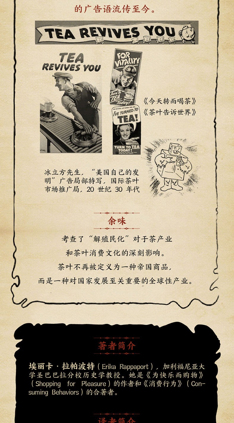 作者埃麗卡·拉帕波特在本書中指出,17—20世紀,茶產業與大英帝國的邊界是重疊的,但從未wan全一致。她還強調了使大英帝國能夠主導但從未wan全控制全球茶葉的生產、貿易和消費的經濟、政治和文化力量。她還深入研究了歐洲人是如何接受、挪用和改變中國茶文化,以在英國及其他全球市場建立廣泛的茶葉需求,並在南亞和非洲建立種植園經濟的。茶產業是早的殖民產業之一,商人、種植者、推廣者和零售商利用帝國資源為全球廣告和政治遊說買單。茶葉激發出的商業模式到今仍然存在,並且對理解政治和宣傳如何影響國際經濟到關重要。
