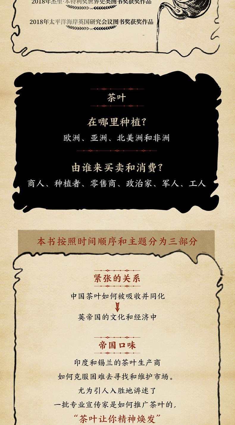 生動描述了中英兩國圍繞茶葉貿易而導致的緊張關係,甚而爆發了鴉片戰爭,之後又詳細講述了中國茶葉是如何被吸收並同化到英帝國的文化和經濟中。