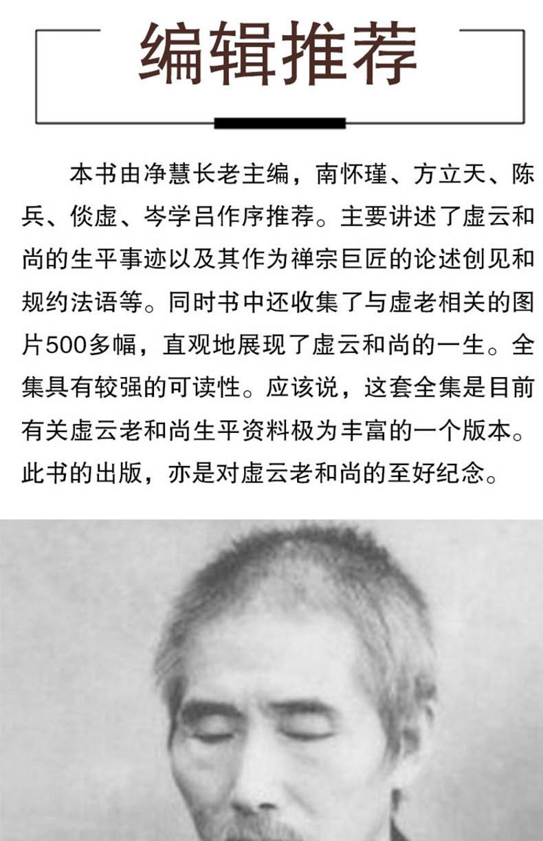《影譜》部分則收錄了與虛雲和尚有關的圖片資料近五百張。為了整合這些資料,我們參照虛雲和尚的生平,將全部圖片資料分成參學時期、雲南時期、福建時期、廣東時期、江西時期、文字墨跡、舍利遺物、無盡追思等八大類,按時間地點的先後順序進行了系統編排,並附以相應的簡短的文字說明。讀者可以透過這些圖片及相應的文字說明,對虛雲和尚的一生有一個基本的直觀的了解。它可以與純文字的《年譜》起到相輔相成的作用。