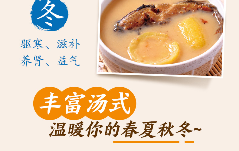 冬天,天寒地凍,萬物蟄藏,人體的陽氣也與自然界的陽氣一樣漸漸收於內,人體抵抗能力降低,疾病特別容易入侵,從中醫的角度看,寒冷更是百病之源,養生應驅寒、滋補。同時,冬天是腎當令,而寒冷最易耗傷腎的陽氣,因此,養生宜養腎、益氣。 《廣東靚湯4》根據冬季的氣候特點,為讀者推薦了驅寒、滋補、養腎、益氣四類適時湯品,並詳細講解了近百款湯品的製作方法、營養功效和烹飪竅門。