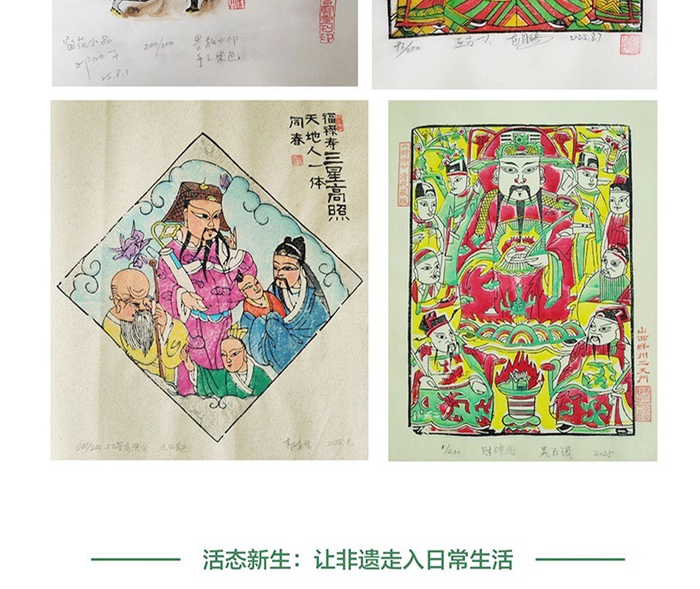 5. 「文化典藏 非遺活化傳承」屬性 系統性學術梳理: 首次以時間線整合山西木版年畫圖像譜系,涵蓋宋元(平陽古版)至近現代(魯藝新年畫運動)的演變脈絡;珍稀史料收錄:獨家呈現黑水城土版原版圖版收藏「舊版收藏品:現存:30年木版收藏品新版原版;突破傳統文獻圖錄的靜態展示,透過365天」日讀一畫」的互動設計,實現」非遺即生活」的沉浸式體驗。