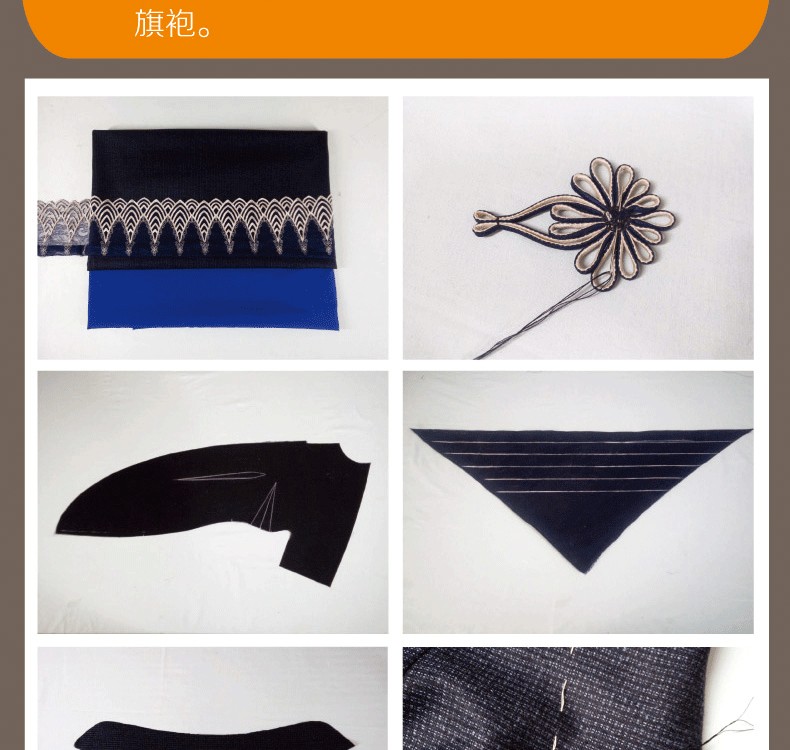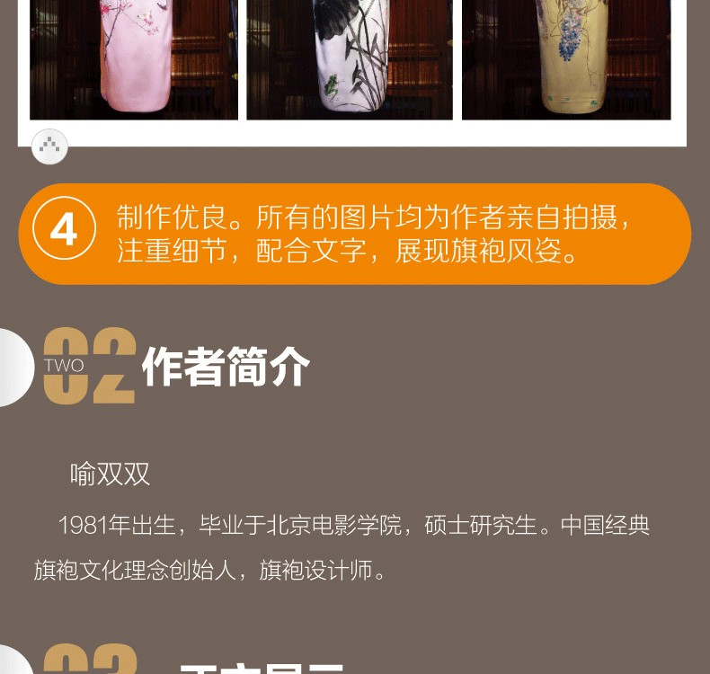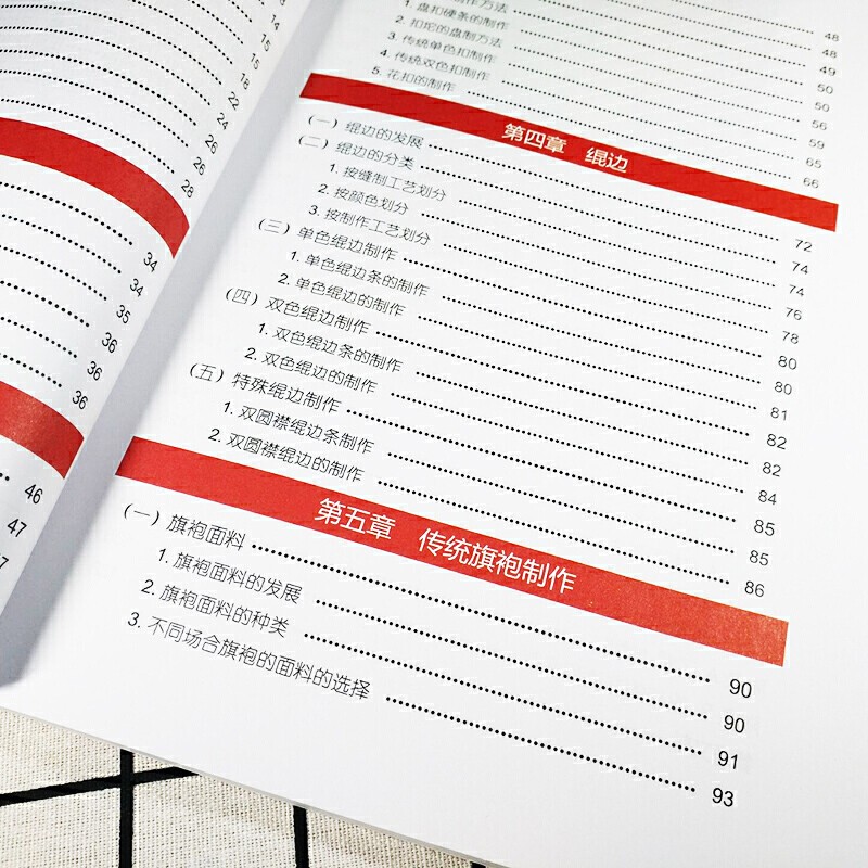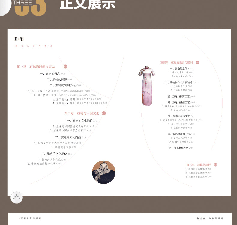《旗袍縫製工藝》所講解的內容包括旗袍發展史、旗袍的樣式和紋樣的變化、量體的方法、盤扣的製作、緄邊的製作、傳統旗袍製作和改良旗袍的製作。在《旗袍縫製工藝》的附錄中還詳細介紹了與旗袍息息相關的刺繡工藝,並且還講解了旗袍洗燙和保存的方法。