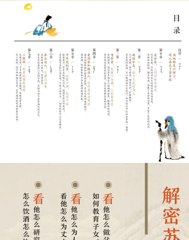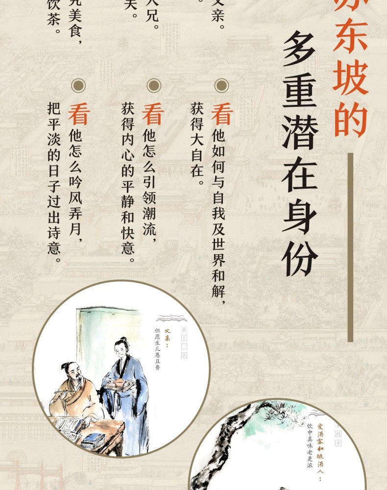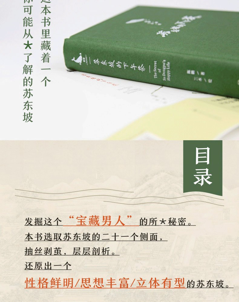 “這本書裡藏著一個你可能從*了解的蘇東坡。” *新視角,深入探究,還原蘇東坡的本來面貌。解密蘇東坡的多重潛在身份。看他怎麼做父親。如何教育子女。看他怎麼為人兄。看他怎麼為丈夫。看他怎麼研究美食,怎麼飲酒怎麼飲茶。看他怎麼吟風弄月,把平淡的日子過出詩意。看他怎麼引*潮流,獲得內心的平靜和快意。看他如何與自我及世界和解,獲得大自在。在他的人生角色裡, 與他的作品偶遇。在詩詞裡,感受他的快樂與悲傷。在文章中,感受他的豪情與浪漫。