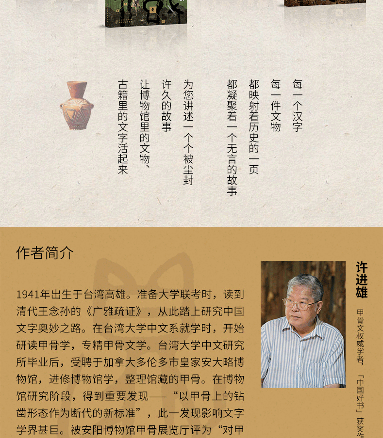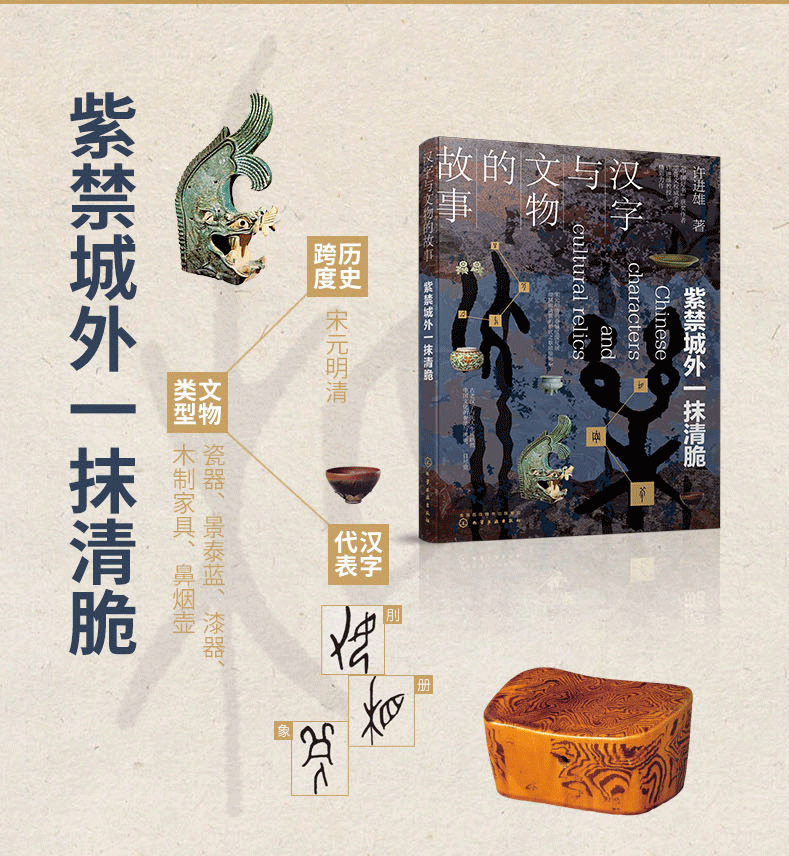 宋元明清時代,中國文物邁向顛峰,伴隨著中國瓷器的世界足跡,景泰藍、青花瓷、景德鎮等享譽國際。大氣恢弘的帝國文化,催生出奇穎巧藝;深厚的人文素養,透過文字一一展現。彈指間悅耳的清音,令人沉吟念想,永難忘懷圍繞著紫禁城的一抹清脆!藉由文物與文字的指引,許進雄教授帶著我們穿梭在宋元明清的富麗宮廷,體驗窯場間百花齊放的妙思靈想,生活與藝術的自然結合,文物與漢字的精巧美麗。
