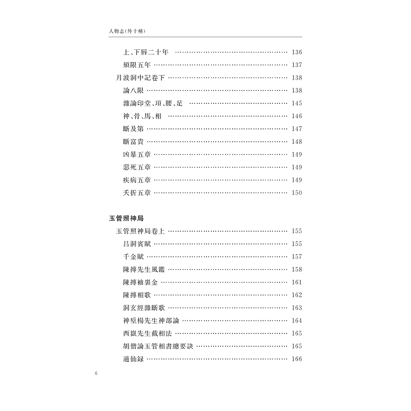 本書收錄《古觀人法》《神相全編》《相法十六篇》《鑑辨小言》《神相鐵關刀》《白鶴仙數相法》等作品。其中《神相全編》卷帙宏富,廣採諸家,內容詳備,堪當中國古典相人術集大成之作品。此書明清時流傳較廣,《麻衣相法》《統會諸家相法》等皆據其剪裁而成。 《古觀人法》與《鑑辨小言》短小精悍、眉目清朗,為文人相法之代表作品。其中《鑑辨小言》又名《冰鑑》,在近現代頗具影響力。 《相法十六篇》《神相鐵關刀》《白鶴仙數相法》三書文辭簡易,實操性強,為術士相法之代表作品。本書蒐集諸多版本,對所選作品進行了精心點校,供相法研究者和愛好者參考。
