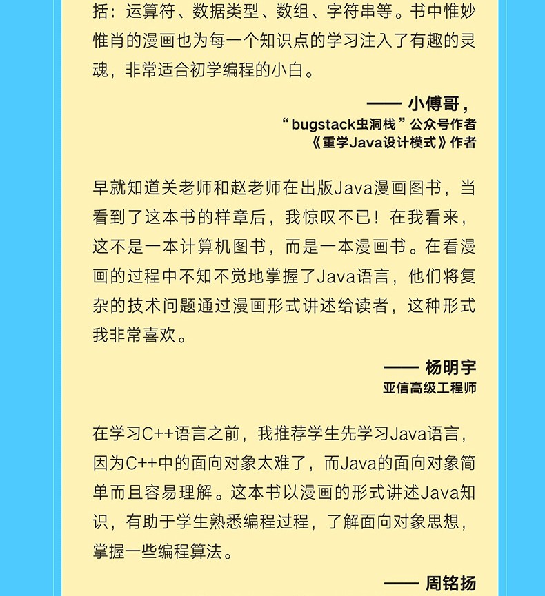 1.本書作者關東昇從事20多年Java編程工作,10多年的IT培訓工作,漫畫作者趙大羽是清華美院畢業的,繪畫功底很深,也從事了多年的用戶體驗培訓。 2.本書採用漫畫加圖解的方式,以輕鬆、愉快、歡樂的學習方式,講解Java中眾多的技術知識點。書中惟妙惟肖的漫畫也為每一個知識點的學習注入了有趣的靈魂,非常適合初學編程的小白。 3.《漫畫Java》在趣味的基礎上,把相關概念梳理得條理清晰,邏輯嚴謹。 4.讓讀者在看漫畫的過程中不知不覺地掌握Java語言,將復雜的技術問題通過漫畫形式講述給讀者