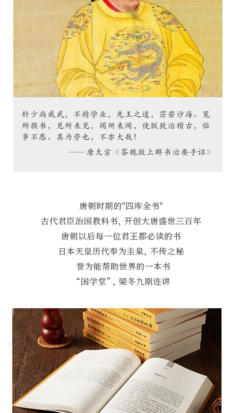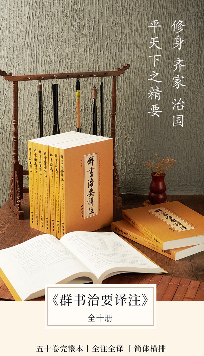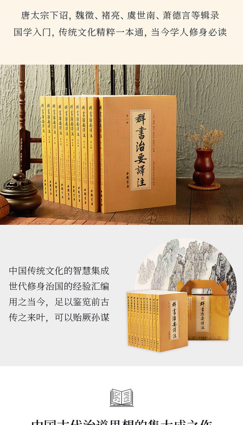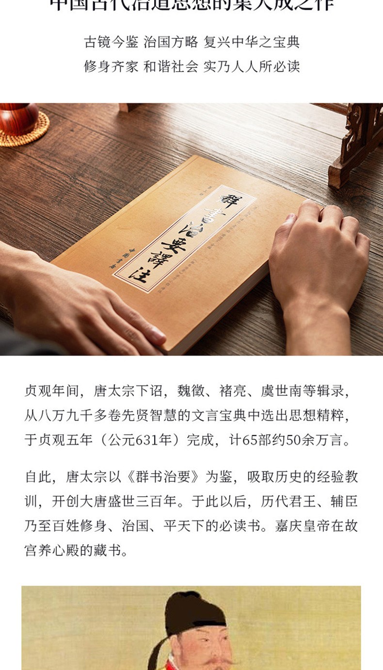 《群書治要譯註(套裝共10冊)》是唐太宗李世民(公元五九九年——六四九年)於貞觀初年下令編輯。太宗十八歲隨父從軍,起義平定動亂的社會,戎馬倥傯十餘年。二十八歲即帝位後,偃武修文,特別留心於治平之道,休生養民。根據《新唐書》記載如下: