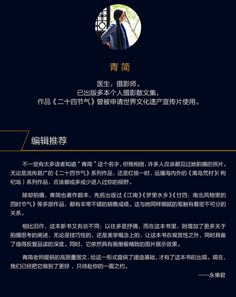 本書突出“輕攝影”的理念,首先,在器材上,樣圖使用單反拍攝(註明參數),微單拍攝(註明參數)和手機拍攝三種不同方式,滿足多種需求。器材以輕便為主;其次,在後期的步驟上,全部用手機軟件修圖,不涉及專業修圖軟件,給繁瑣的後期減負;再次,在拍攝的想法和理念上,本書直截了當地告訴讀者,怎麼拍是更好的,不用去死記硬背很多枯燥的數值,搞懂一些生澀的理念。