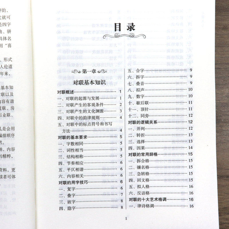 6: 對聯基本知識包括:起源與發展,韻律規則,標點符號和書寫方法,基本要求,用字技巧,邏輯關係,常用辭格,十大藝術格調,修辭手法,對聯的分類,評價標準,常用術語,實用對聯的寫作方法;