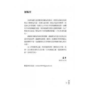 在工作與教學之餘,利用零碎時間,整理出生平第一本書,以自費出書的方式出版,若有疏漏之處,還請讀者見諒,並來信告知。