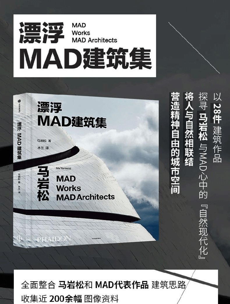 在《漂浮:MAD建築集》中,馬岩松解析了自己近14年的代表建築作品。馬岩鬆的建築可以說是將「自然現代化」。透過28件建築作品,200多幅清晰實景照片、珍貴建築圖、立體視覺化圖,深入了解馬岩鬆的建築與自然、空間的關係,沉浸式觀賞馬岩鬆的建築世界。