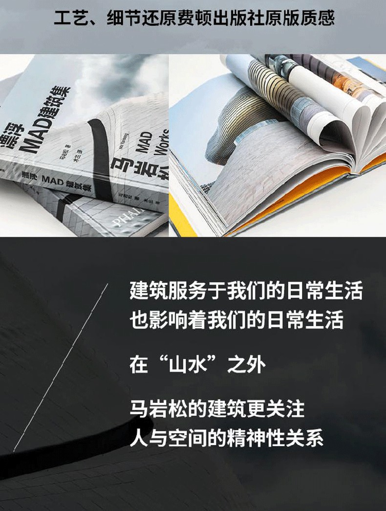 書中除了聲名赫赫的夢露大廈、哈爾濱大劇院,還囊括山丘庭院、UNIC等MAD新近建築作品,透過分析藝術作品、研究探討和展陳項目,帶領我們了解馬岩松「山水」概念的起源,對建築「自然觀」、人與空間的態度。在與陳伯康的對談中,對現代主義建築家密斯·凡·德·羅、路易斯·康的建築理念進行更具中國特色的解讀,為我們理解現代主義建築提供全新思路。