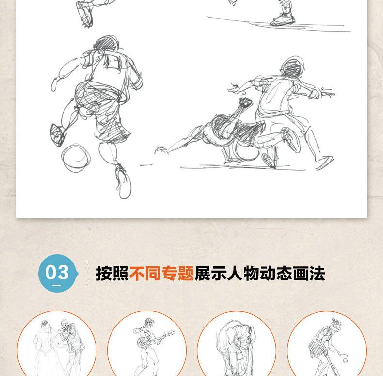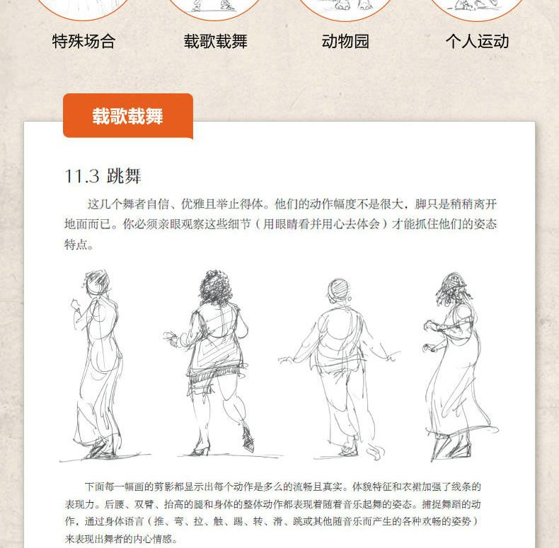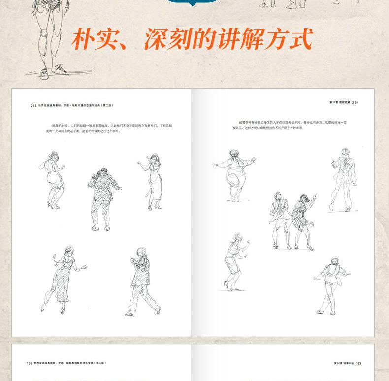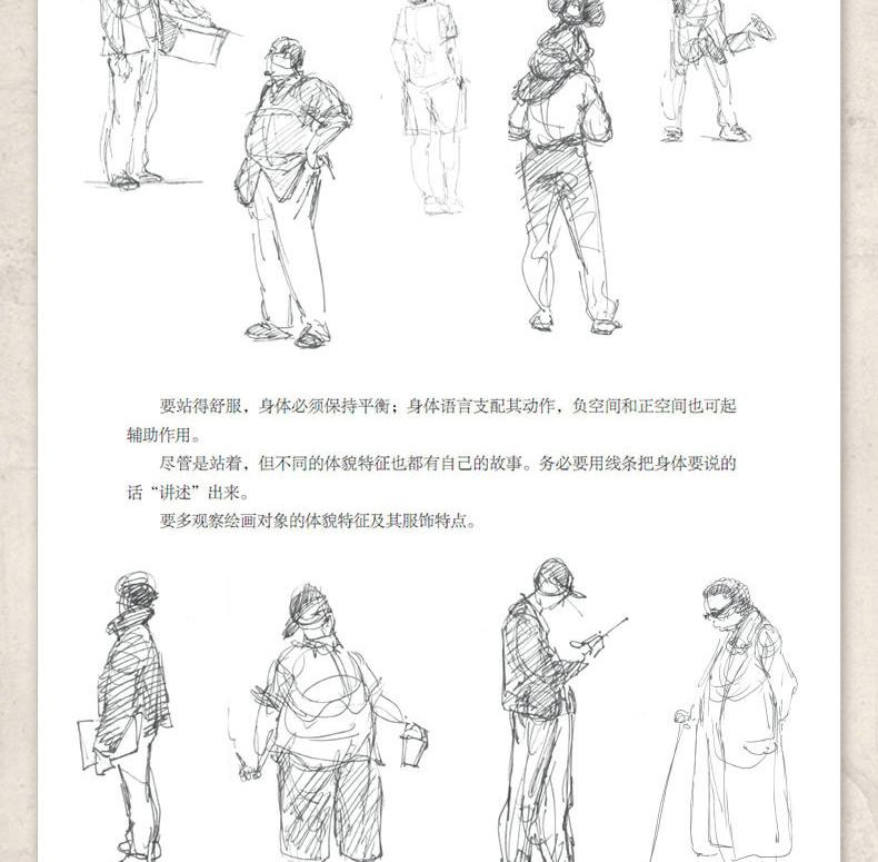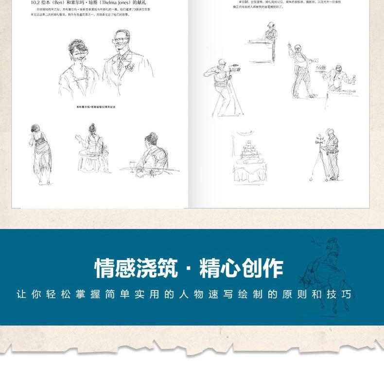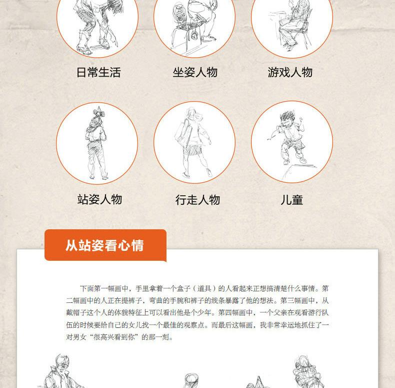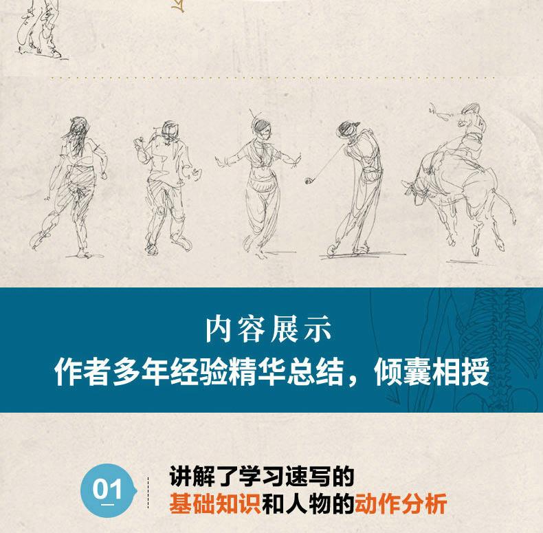 全書共17章。首先講解速寫的基礎知識和人物的動作分析;然後從不同的角度詳細地講解日常活動中的人物特徵、坐姿的畫法、玩桌上游戲的人的畫法、站姿的畫法、行走人物的畫法,以及兒童的畫法;最後按照不同專題展示特殊場合的人物的畫法、載歌載舞的人物的畫法、動物園中的人物的畫法,
