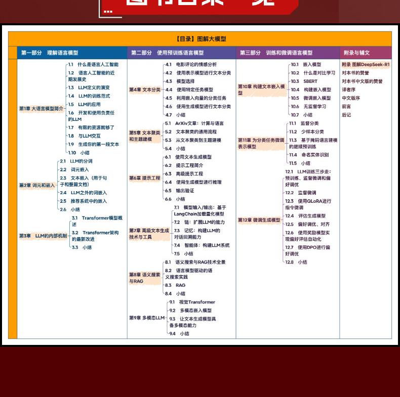 全書分為三部分,依序介紹語言模型的原理、應用及最佳化。第一部分 理解語言模型(第1~3章),解析語言模型的核心概念,包括詞元、嵌入向量及Transformer架構,幫助讀者建立基礎認知。第二部分 使用預訓練語言模型(第4~9章),介紹如何運用大模型進行文本分類、聚類、語意搜尋、文本生成及多模態擴展,提升模型的應用能力。第三部分 訓練與微調語言模型(第10~12章),探討大模型的訓練與微調方法,包括嵌入模型的建構、分類任務的最佳化及生成式模型的微調,以適應特定需求。