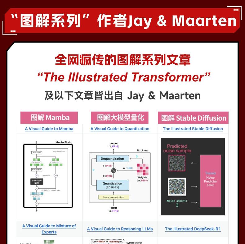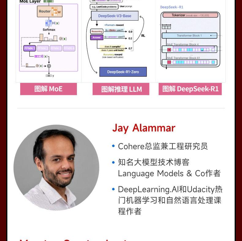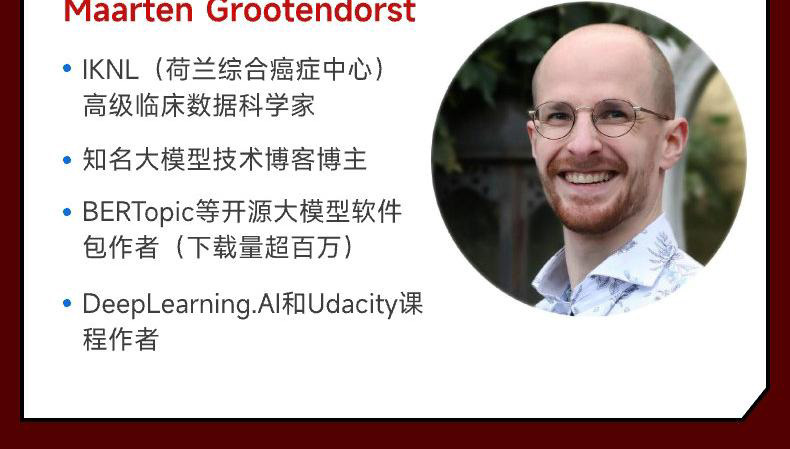 Jay Alammar Cohere總監兼工程研究員,知名大模型技術部落格Language Models & Co作者,DeepLearning.AI和Udacity熱門機器學習和自然語言處理課程作者。 Jay的圖解系列文章「The Illustrated Transformer」「The Illustrated DeepSeek-R1」全網瘋傳,累積了數百萬專業讀者。 Maarten Grootendorst IKNL(荷蘭綜合癌症中心)高級臨床資料科學家,知名大模型技術部落格部落客,BERTopic等開源大模型軟體包作者( 量超百萬),DeepLearning.AI和Udacity熱門...