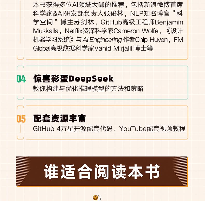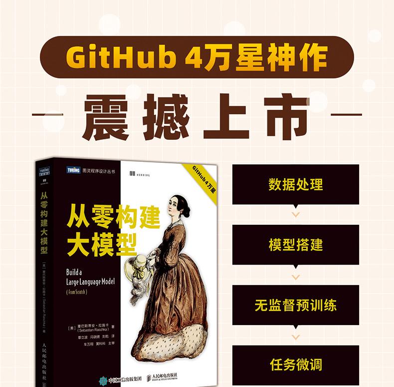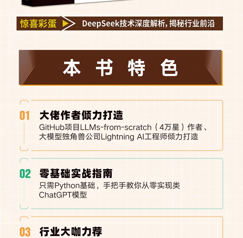 Github4萬星神作,資料處理+模型搭建+無監督訓練+任務微調,僅需掌握Python,帶你從零構建AI大模型; 揭開大模型背後的面紗,讓讀者了解其工作原理,學習如何評估其質量,並掌握微調和改進的具體技術;強調親手實踐,使用PyTorch 而不依賴於解庫,透過微調和改進的具體技術;透過本書的學習,讀者可以創建自己的小型但功能強大的模型,並將其作為個人助手使用; 更有驚喜彩蛋:深度解析DeepSeek大模型背後技術,揭秘行業前沿!