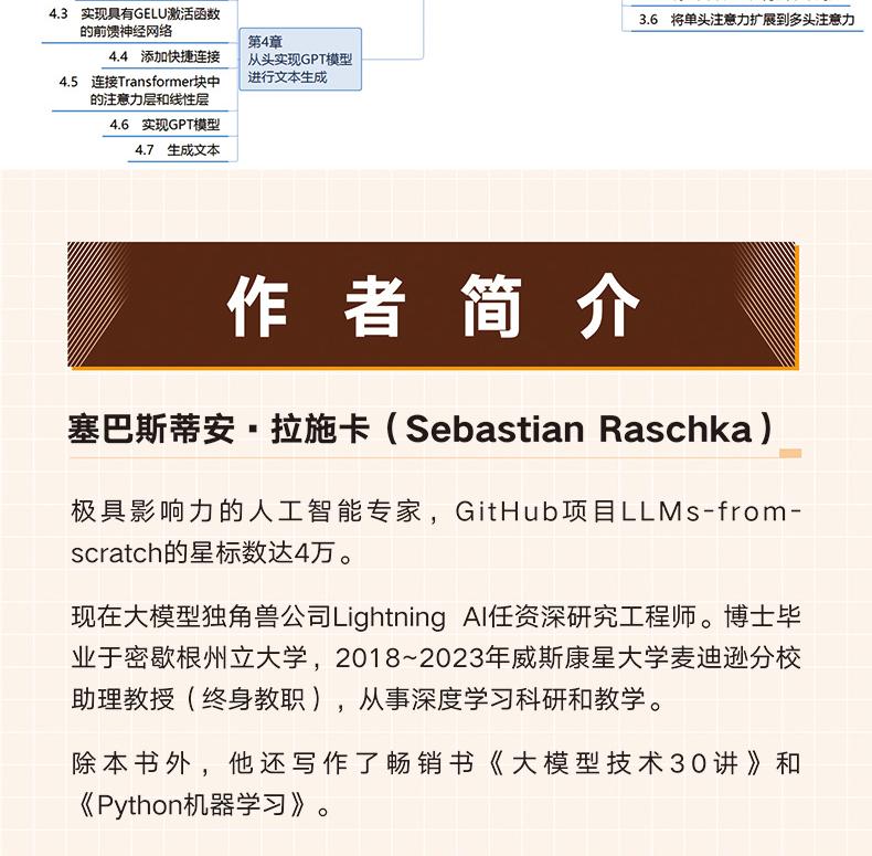 本書是關於如何從零開始建立大模型的指南,由暢銷書作家塞巴斯蒂安·拉施卡撰寫,透過清晰的文字、圖表和實例,逐步指導讀者創建自己的大模型。在本書中,讀者將學習如何規劃和編寫大模型的各個組成部分、為大模型訓練準備適當的資料集、進行通用語料庫的預訓練,以及自訂特定任務的微調。此外,本書也將探討如何利用人工回饋確保大模型遵循指令,以及如何將預訓練權重載入到大模型中。