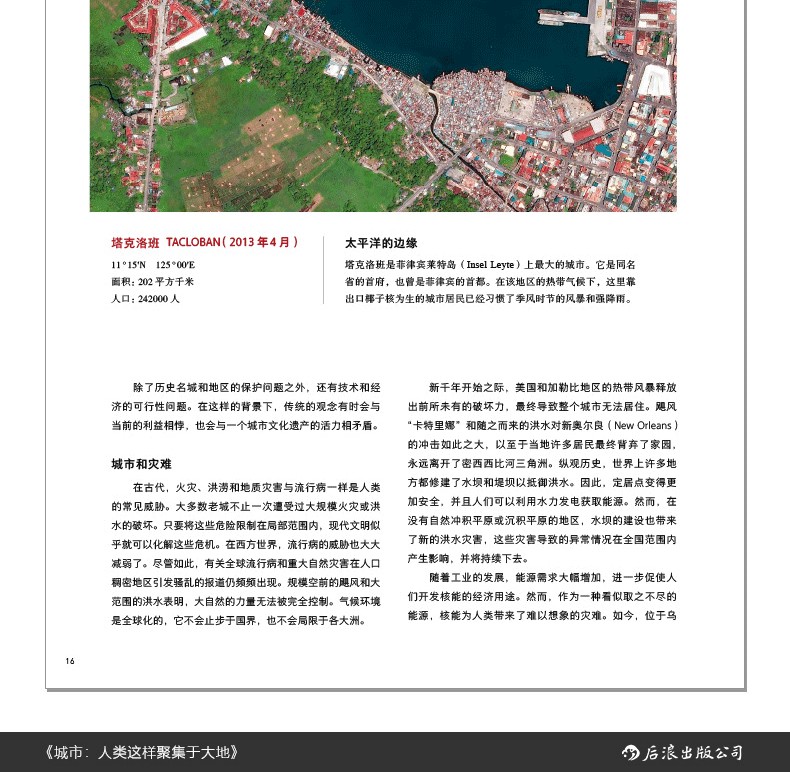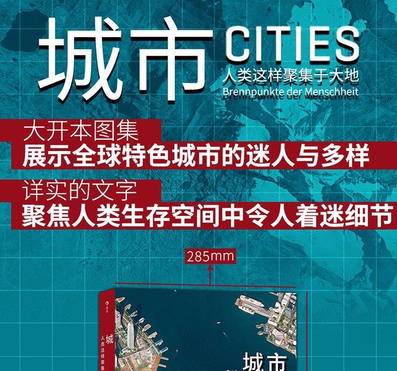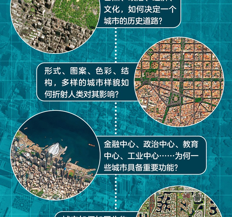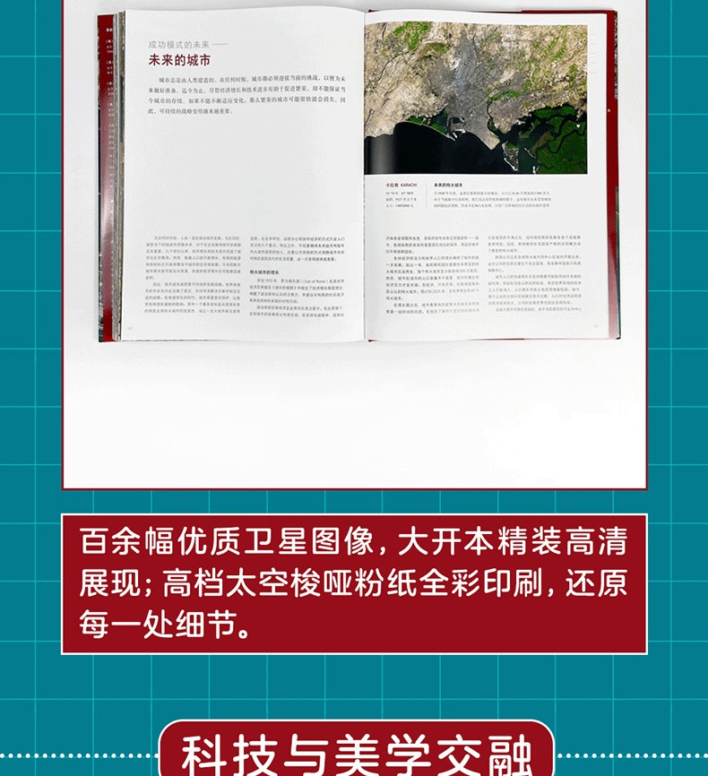 本書收錄了百餘幅高清衛星攝影圖像,展示了世界不同類型城市的規模、結構的多樣性,並用言辭優美的文字簡要介紹了當地自然條件、城市特徵及風土人情。從距離地球400千米到900千米的高空俯瞰地球,無論是流光溢彩的國際大都市倫敦、巴黎,還是人跡罕到的安第斯山脈中的“金城”,抑或是空無一人的“鬼城”普里皮亞季,城市的豐富色彩無時無刻不在衝擊著人們的視域,在人類中留下墨重彩的一筆文明。
