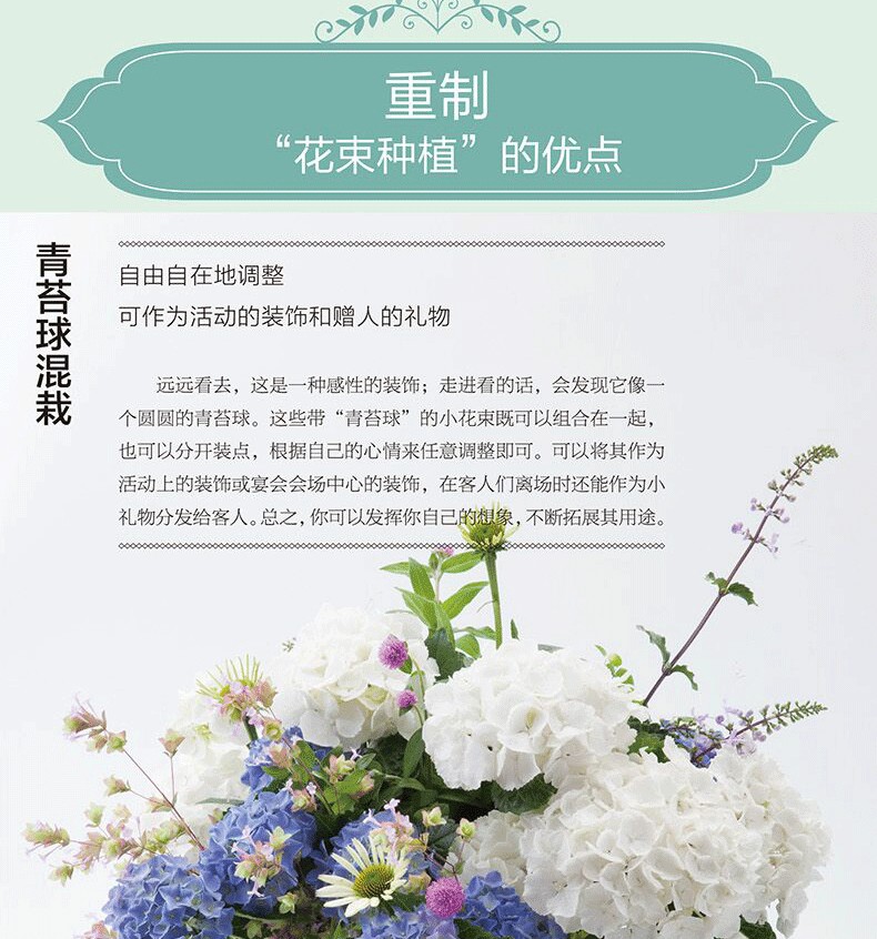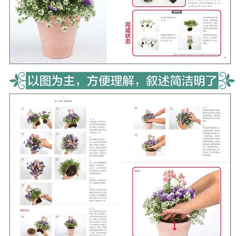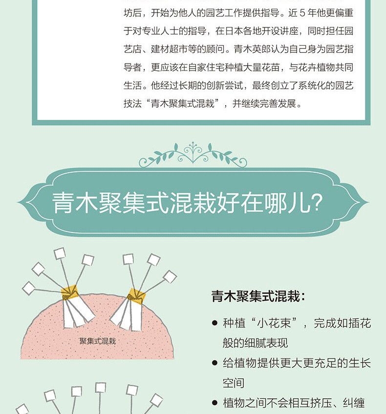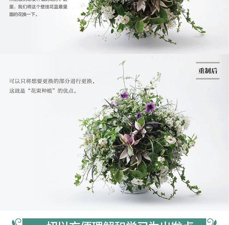 本書是繼《花草薈:青木式混栽技法入門》後,日本讀者期待的、建議出版的混栽教科書。青木英郎夢想能將混栽呈現出花藝作品的美感,於是自創了“青木聚集式混栽”,本書更系統、全面、易懂地介紹了這種使用帶根花苗打造組合盆栽的全新園藝技法。通過5種不同類型的作品——單個小花束、花環、花盆、壁掛花籃、帶根花束,告訴你更多的園藝方法,用更詳細的高清多角度步驟圖和示意圖,手把手教你使用“小花束”創造擁有細膩表現的作品。而當這些小花束長得“變形”時,通過調整和重組即可修正或誕生出新的作品。另外,書中還附大量青木英郎監督創作的充滿個性的作品,可供讀者參考欣賞。