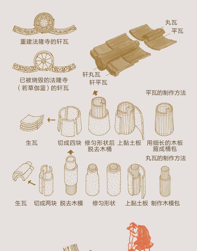 法隆寺的昭和大修理,從昭和九年四月到昭和二十九年 (1934—1954),歷經二十年。當年的我以26歲之齡,拜祖先之威名,受命擔任法隆寺東院禮堂的大木匠師。之後除了戰事,其餘時間幾乎都置身在法隆寺的工地現場,努力學習。說是學習,倒也不是整天坐在事務所裡,而是到工地就創建以來經過多次小型整修的補修材料進行判斷、拆除,恢復成創建當時的形式。對我而言,這就是我的工作,也是一種學習。通過這樣的工作,探索創建之時木作工程的想法,並與現代比較,二十年來始終對古人的技術和功夫讚歎不已。興建房屋時,重要的是地基。覆蓋著厚厚的黏土層、不會太乾燥的土地,被稱為“地山”(地表)。用於塗牆、填塞屋頂的泥土,都是以地山優質的黏土揉製而成的。木造建築的生命是屋頂,利用低溫長時間燒烤黏土做成的屋瓦,既是屋頂的生命,也是該建築物的生命所在。組裝木材時所用的鐵釘也必須通過低溫長時間鑄造。不論是屋瓦還是鐵釘,來自高溫短時間處理、大量生產方式的產品,其生命都是短暫的。