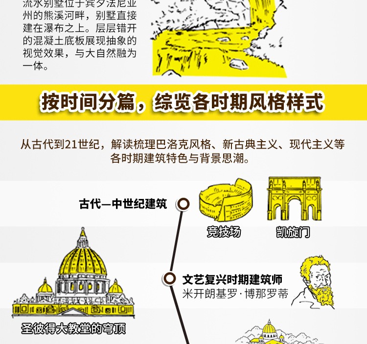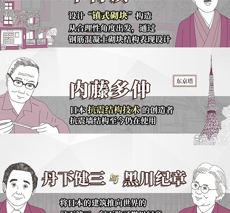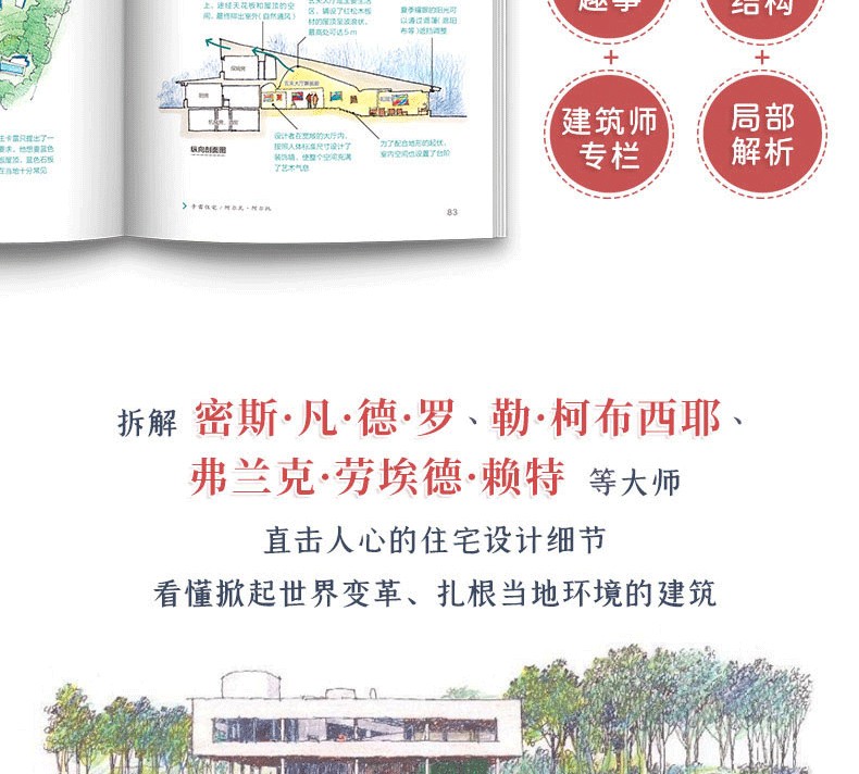 本書介紹了60多座世界著ming的住宅建築,包括31座掀起世界變革的住宅建築、15座日本經典住宅,以及9種紮根當地環境的住宅,卷末集錦則介紹了日本建築發展歷程中11種建築的由來。此外,本書的建築家專欄收錄了22位建築大師的簡要介紹。書中先對住宅進行總體介紹,然後分別就其具體的設計精彩之處進行解析,還搭配了平面圖,分析住宅內部格局的佈置,以供讀者參考。本書圖片採用手繪形式,圖文精美,文字精煉,可閱讀性較強。通過圖文對照,讀者不但可以看得見此住宅的內外設計,還可以感受到居住在其中的人文生活。