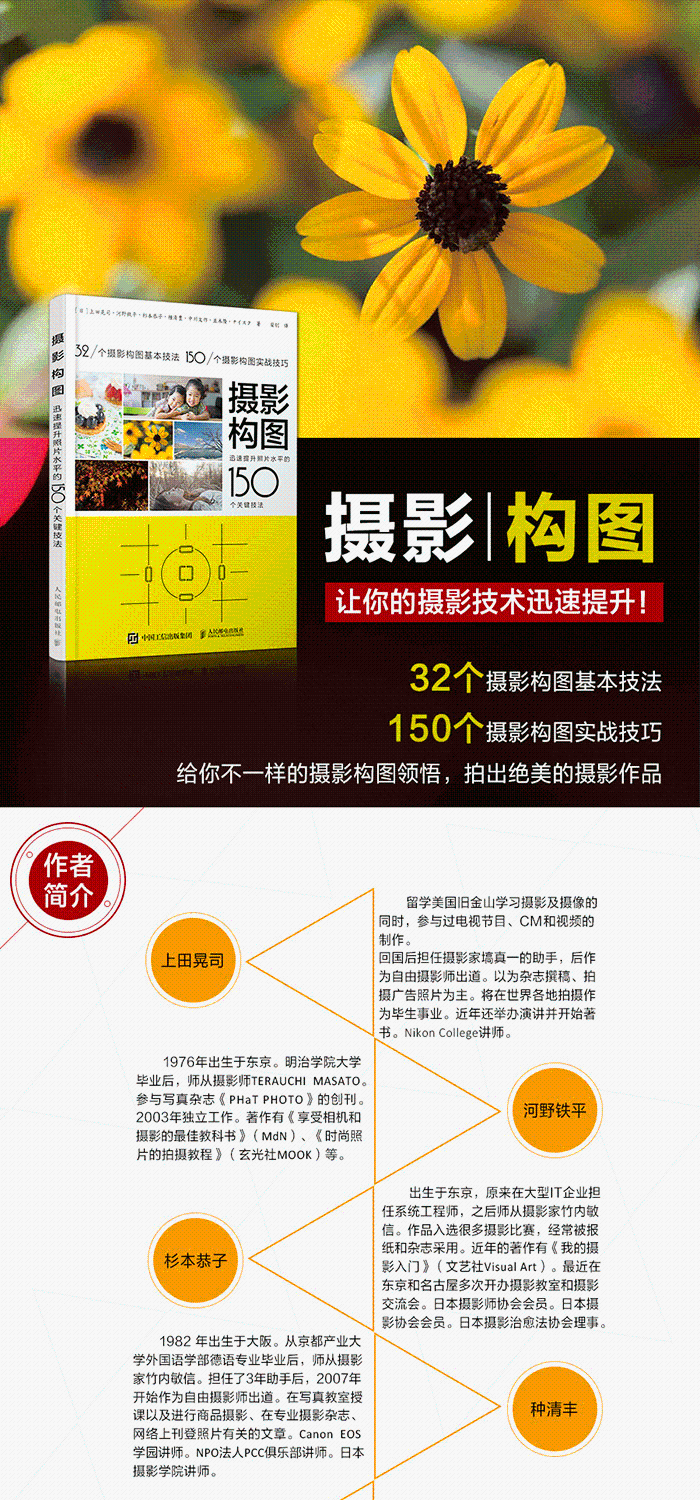 上田晃司(うえだ·こうじ):留學美國舊金山學習攝影及攝像的同時,參與過電視節目、CM和視頻的製作。回國後擔任攝影家塙真一的助手,後作為自由攝影師出道。以為雜誌撰稿、拍攝廣告照片為主。將在SJ各地拍攝作為畢生事業。近年還舉辦演講並開始著書。 Nikon College講師。河野鐵平(こうの·てっぺい):1976年出生於東京。明治學院大學畢業後,師從攝影師TERAUCHI MASATO。參與寫真雜誌《PHaT PHOTO》的創刊。 2003年D立工作。著作有《享受相機和攝影的**佳教科書》(MdN)、《時尚照片的拍攝教程》(玄光社MOOK)等。杉本恭子(すぎもと·きょうこ):出生於東京,原來在大型IT企業擔任系統工程師,之後師從攝影家竹內敏信。作品入選很多攝影比賽,經常被報紙和雜誌採用。近年的著作有《我的攝影入門》(文藝社Visual Art)。 **近在東京和名古屋多次開辦攝影教室和攝影交流會。日本攝影師協會會員。日本攝影協會會員。日本攝影治愈法協會理事。種清豐(たねきよ·ゆたか):1982 年出生於大阪。從京都產業大學外國語學部德語專業畢業後,師從攝影家竹內敏信。擔任了3年助手後,2007 年開始作為自由攝影師出道。在寫真教室授課以及進行商品攝影、在專業攝影雜誌、網絡上刊登照片有關的文章。 CaDn EOS 學園講師。 NPO法人 PCC俱樂部講師。日本攝影學院講師。中川文作(なかがわ· ぶんさく):1983 年出生於茨城縣。東京攝影學園畢業後,在Studio 60 工作。辭職後擔任攝影師中島繁樹的助手,2008 年作為自由攝影師出道。雜誌、廣告、人物攝影為主,在很多領域都FC活躍。並木隆(なみき· たかし):1971 年出生於東京。高中在校時結識攝影家丸林正則。從東京攝影專業學園(現:東京Visual Art’s)退學後,成為自由攝影師。現在為很多雜誌供稿,並且在CaDn EOS學園等很多攝影教室中擔任講師。主要是以花為主題進行創作。日本自然科學攝影協會會員、日本攝影家協會會員。