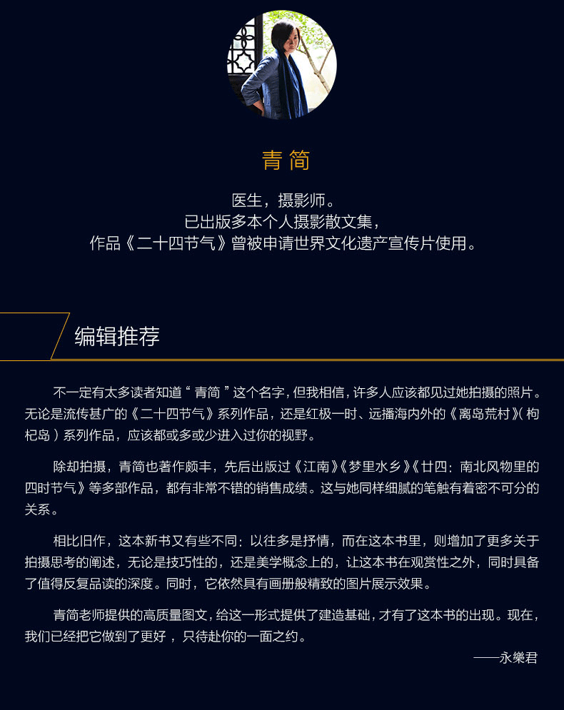青簡,醫生,攝影師。已出版多本個人攝影散文集,作品《二十四節氣》曾被申請世界文化遺產宣傳片使用。