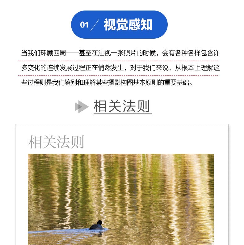 3.豐富呈現形式:以精妙攝影作品為直觀圖例,搭配清晰明了的圖解與說明,圖文並茂的呈現形式,讓抽象的構圖知識變得生動易懂,降低學習難度。