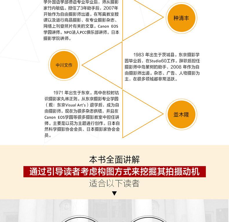 本書適合攝影愛好者,尤其是在構圖方面遇到瓶頸的攝影愛好者參考閱讀,對於有一定經驗的攝影師,本書也同樣適用。