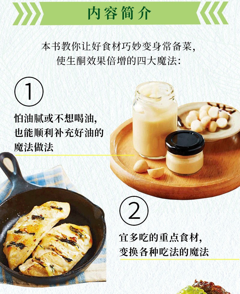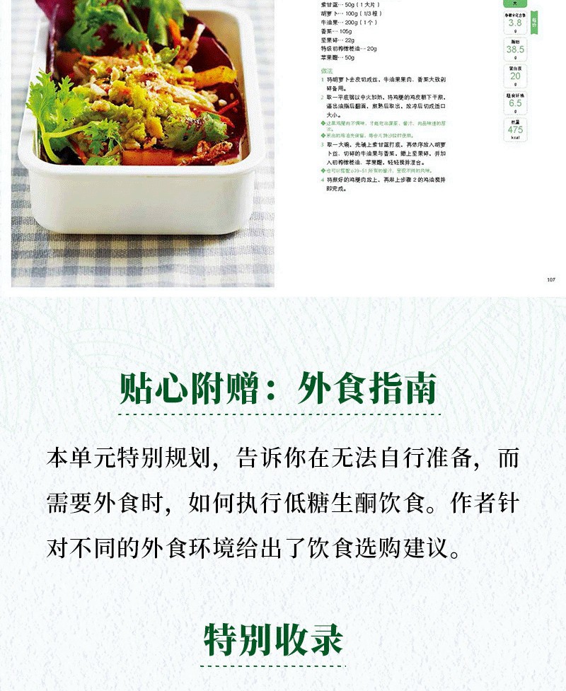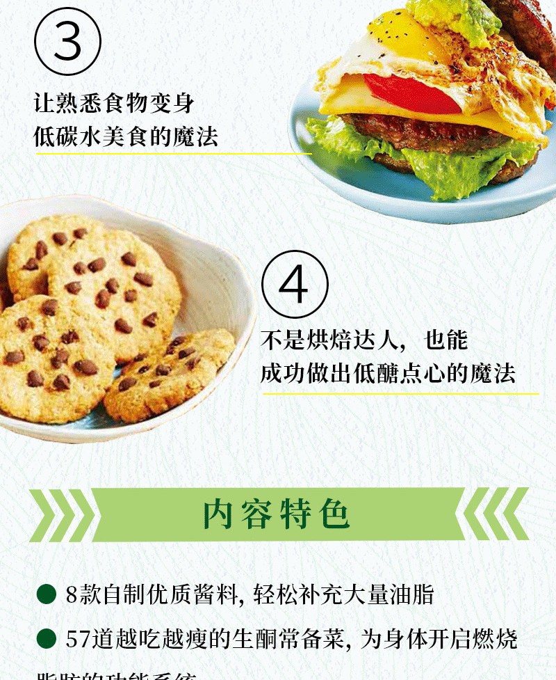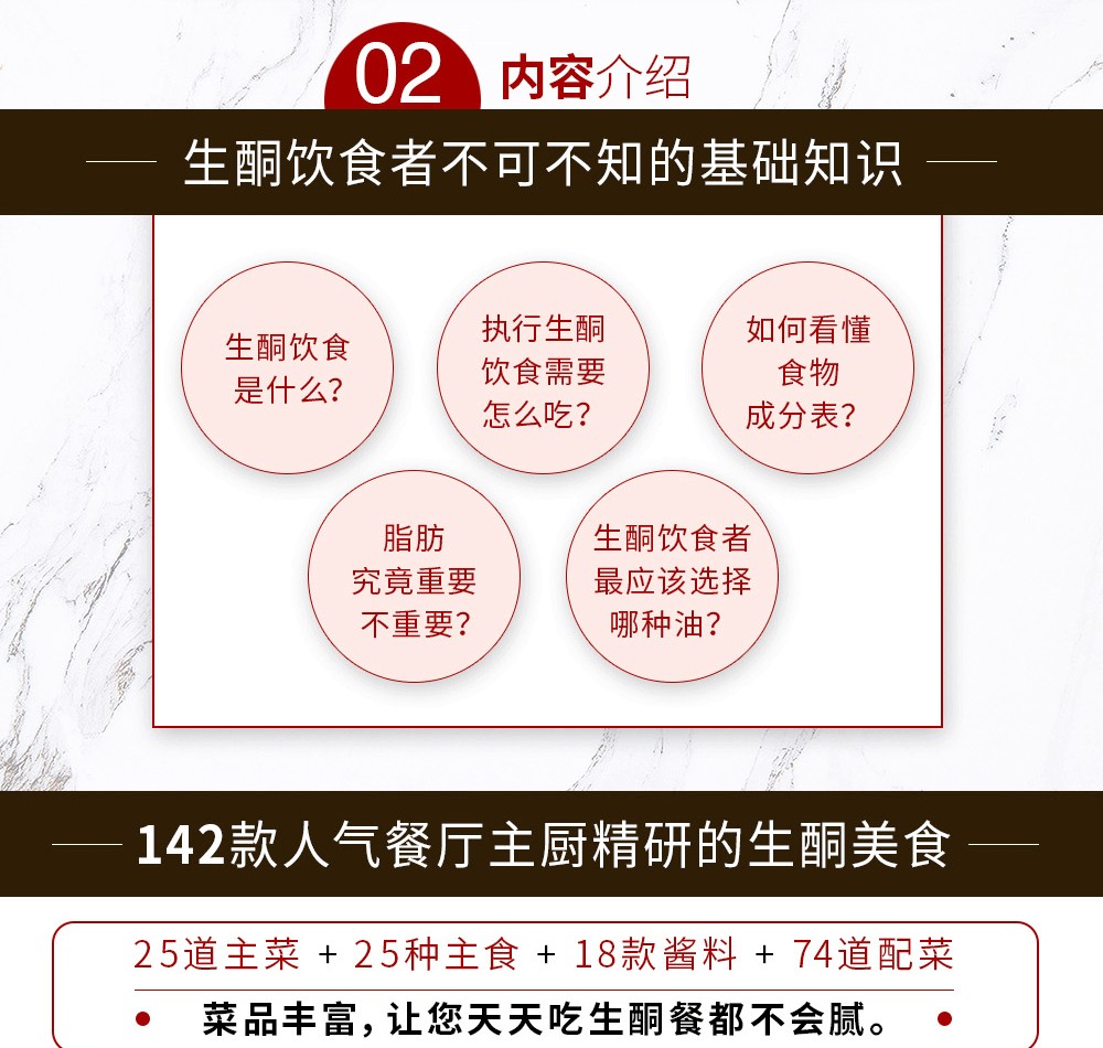 對於生酮飲食者來說,每天吃什麼菜很令人困擾,每一餐要如何搭配菜品更是讓人頭疼,大家往往苦惱於計算一餐中碳水化合物、脂肪、蛋白質的能連佔比,若是一不小心算錯,就會導致生酮失敗。本書不僅有142款美味,更有100個建議套餐,正好能解決大家的難題。