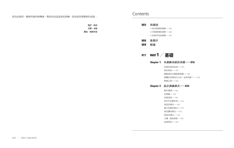 本書的這套課表系統將帶你深入了解設計一份優質的力量課表應該具備的技術性知識,包括動作選擇、訓練順序以及訓練量的增減等,教你如何建立有效、彈性、長期且個人化的訓練計畫。此外,由於使用這套系統也須仰賴教練或運動員的直覺,才能機動地調整動作難度與訓練量,書中各章節的「教練之眼」將提點你身為一位教練或運動員應該在訓練中註意哪些地方,才能在追求訓練目標的同時避免過度訓練。