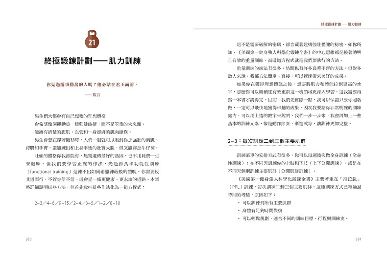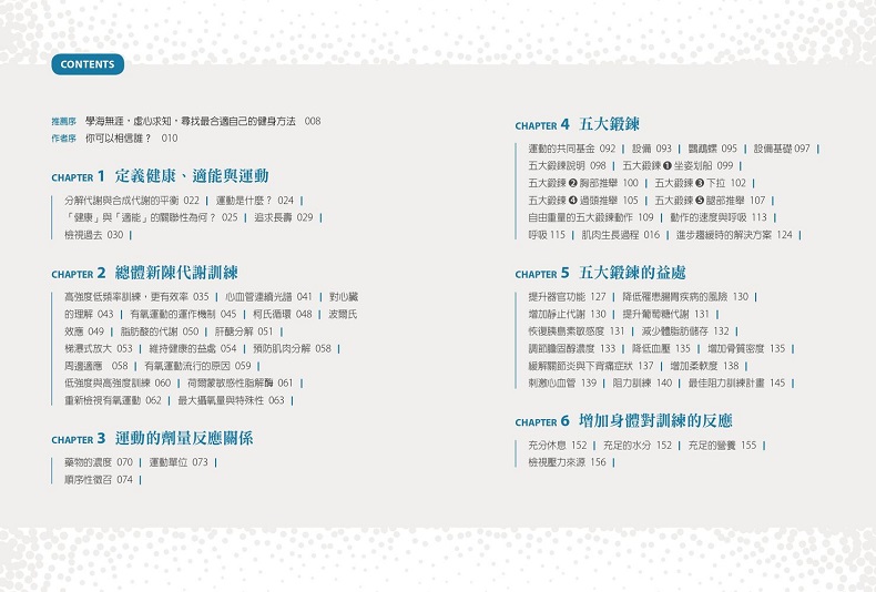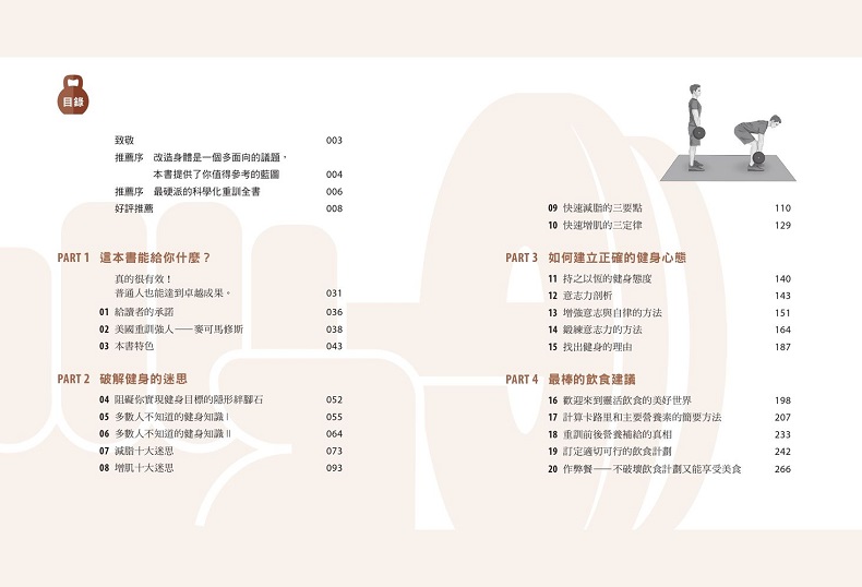 本書介紹了正確的飲食方式、運動觀念和訓練方法,除了能鍛鍊出強壯健康的身心,同時也能獲得良好健美的體態。 ——吳肇基(骨科專科醫師、臉書粉絲專頁「大夫訓練」編輯)